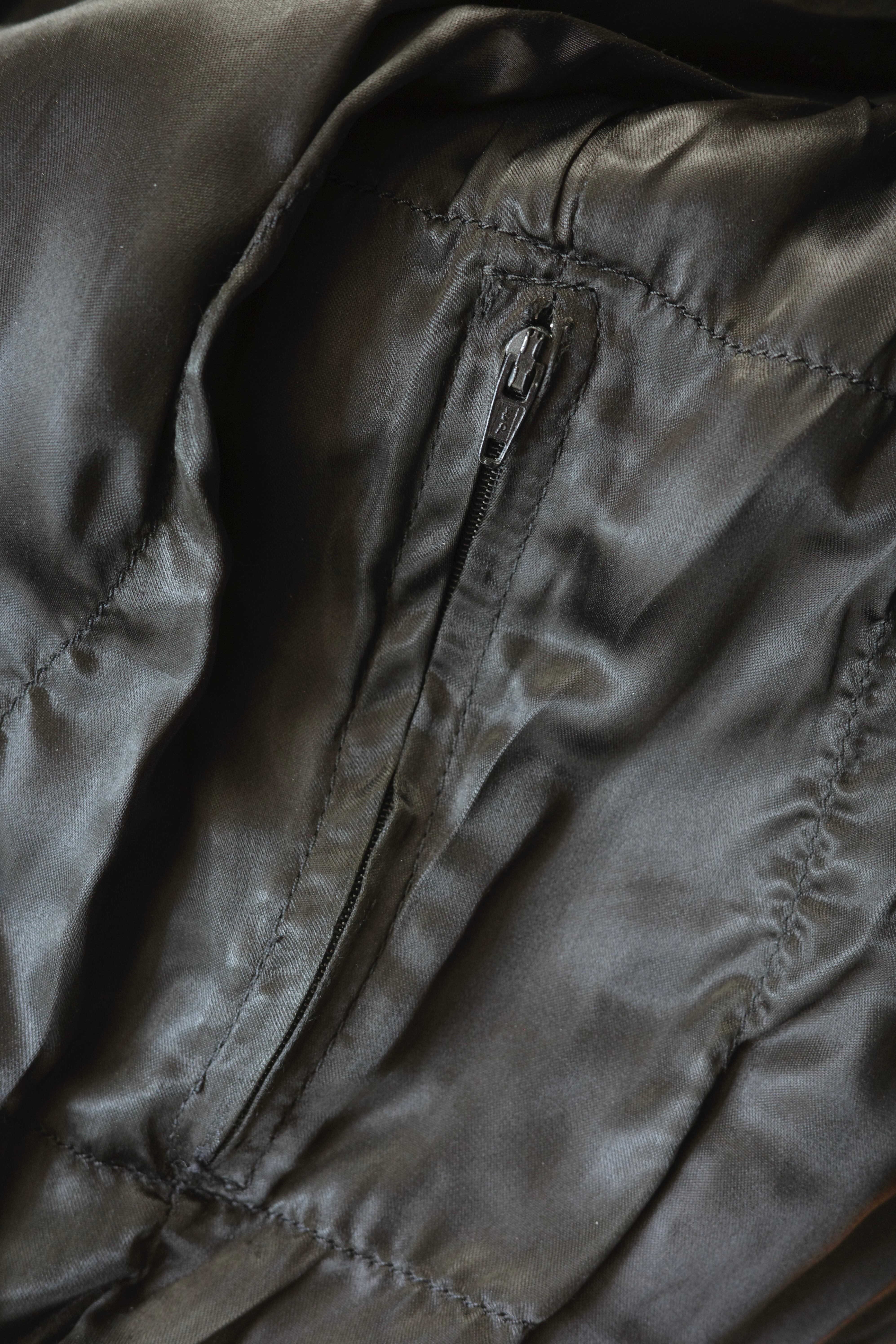 イタリアンカラーのようなラウンドしたシンプルな襟。フロントはジッパーのみと空軍のジャケットらしいシンプルな作りですが、MA-1のようなシガーレットポケットが良いパンチになっています。色はインクブルーの色味で、ボアが黒色と相性の良いトータルバランスの整った一枚です。