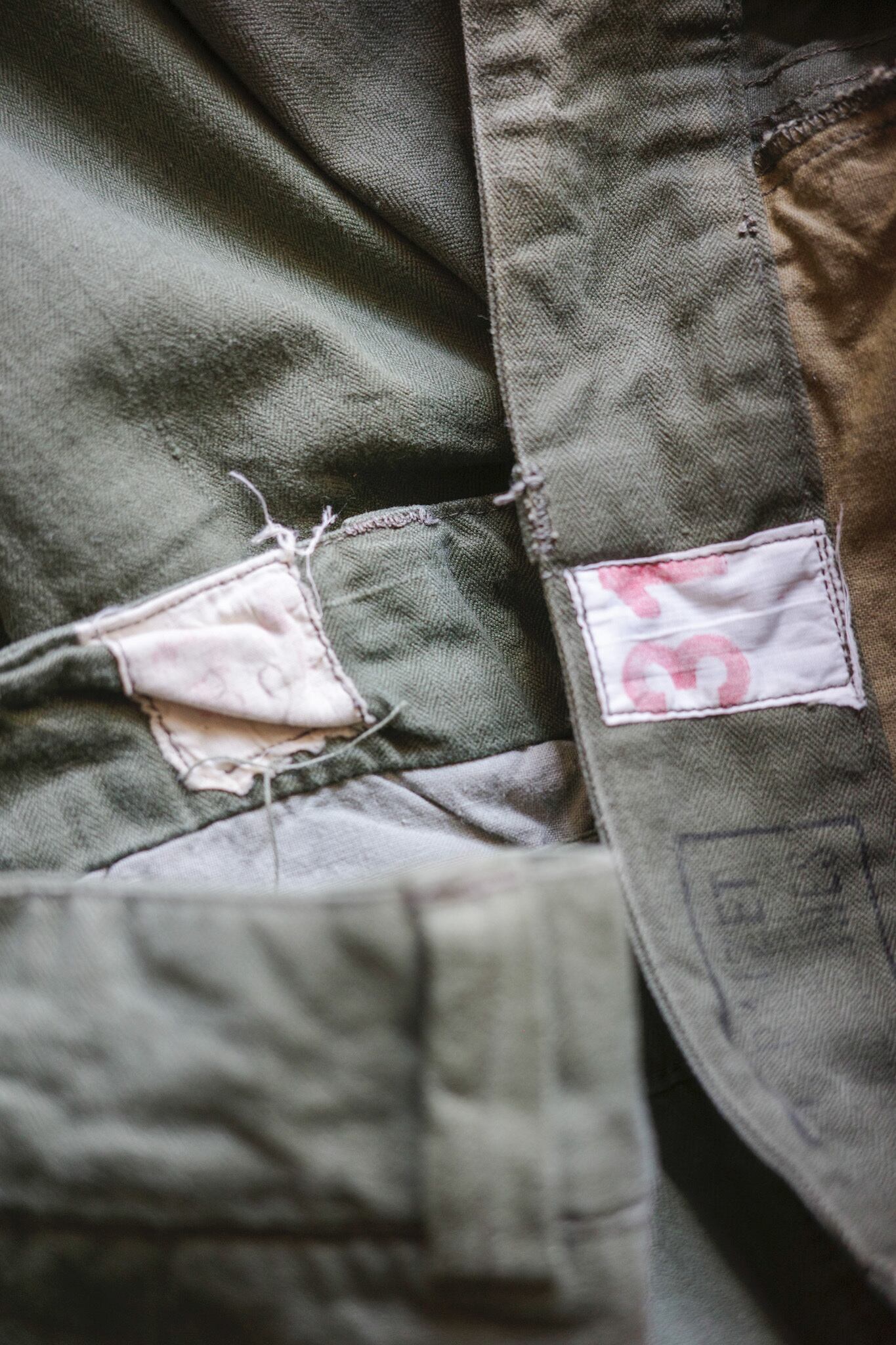 この後期型陸軍タイプの特徴として、生地が最初に挙げられるかと思います。生地はV字形が連なった模様からニシンの骨のような骨組みから「ヘリンボーン」と名付けられた生地が採用されています。履き心地も前期のツイル地に対して柔らかく履きやすい印象です。