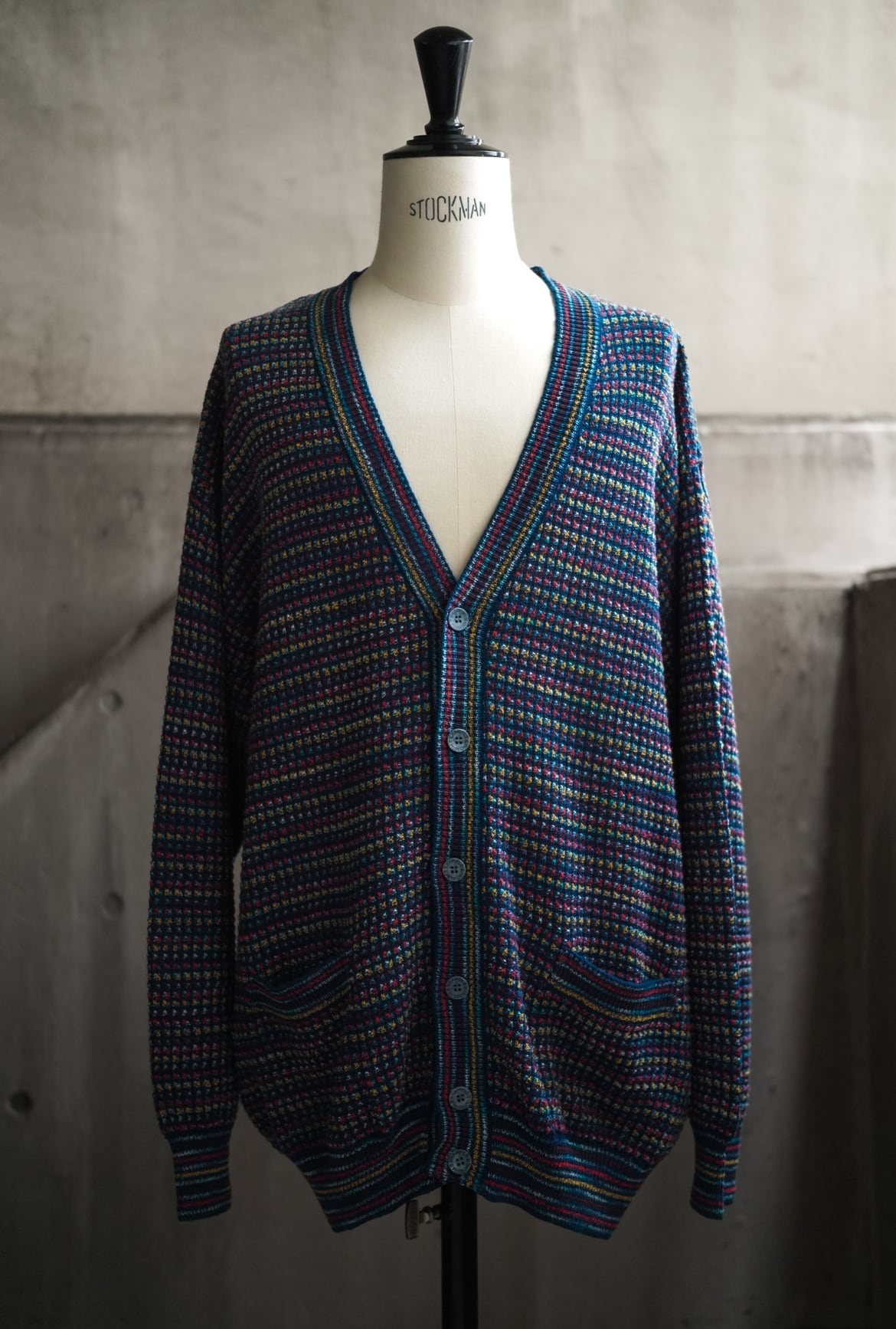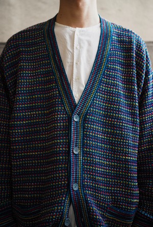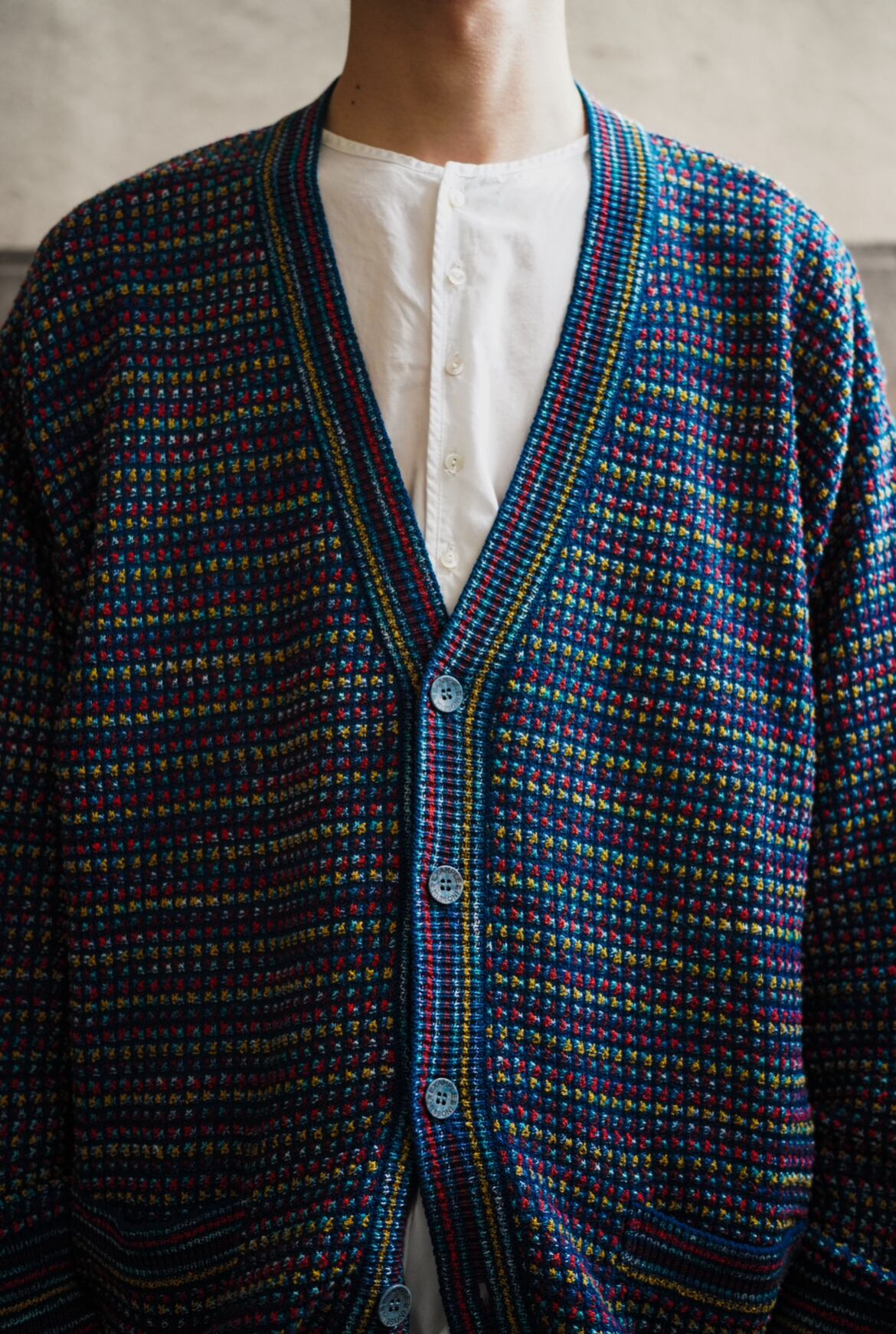 ドットパターンのデザインを、5色以上のカラーを用いて表現した極彩色のニットカーディガンとなります。