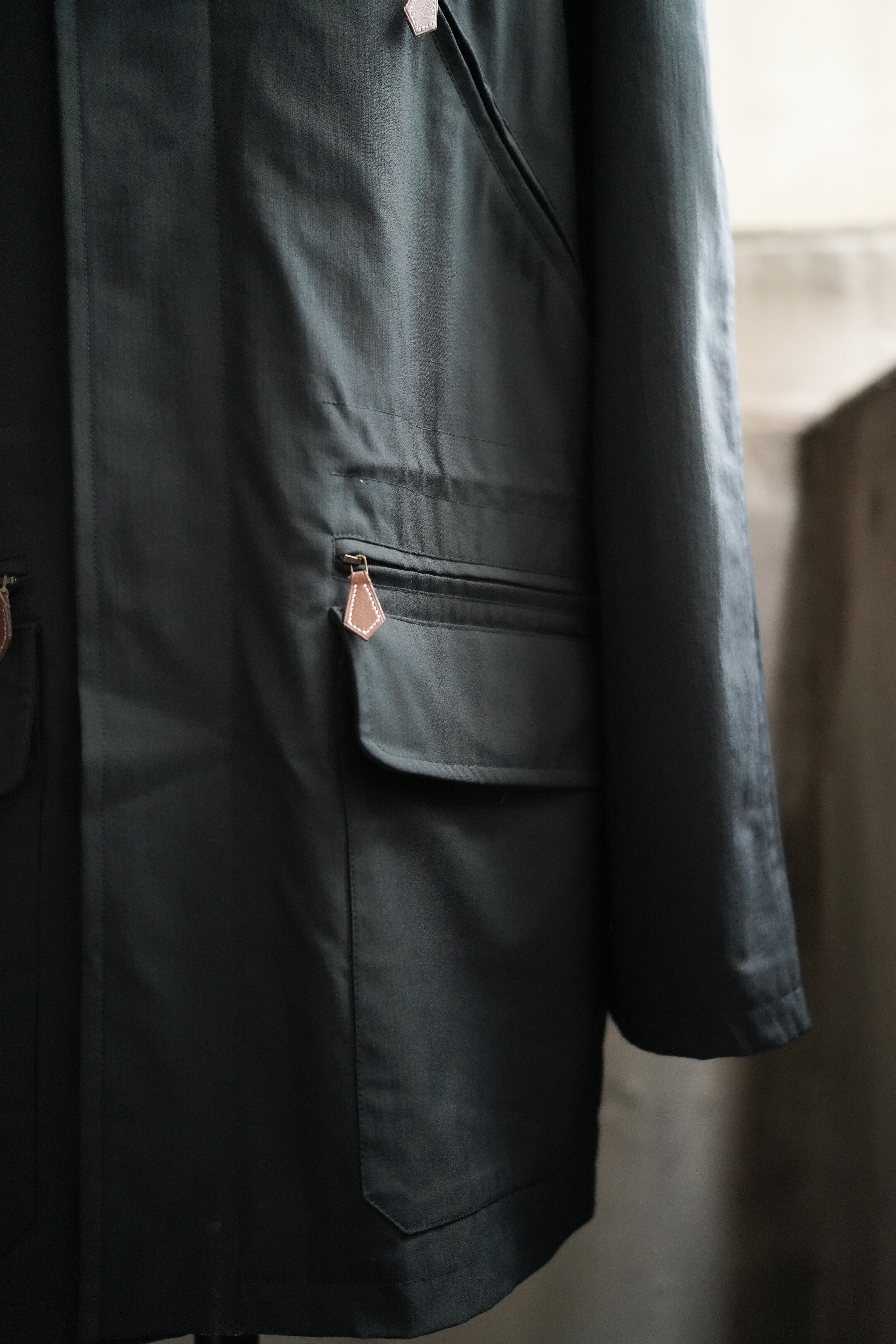 各所にはエルメスらしいアイコニックな、レザーの引手を使用したジップが点在。