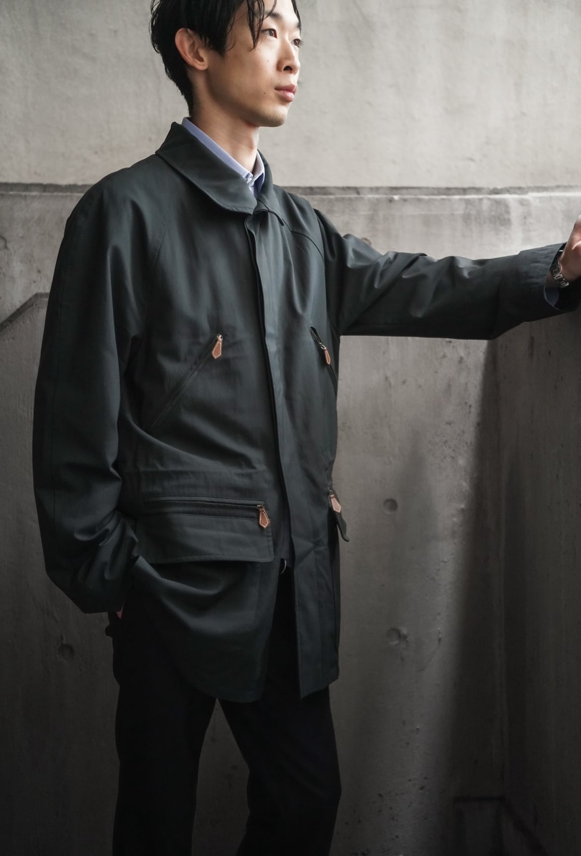 深みのあるダークグリーンのナイロンに、無駄を削ぎ落としたクリーンなシルエット。