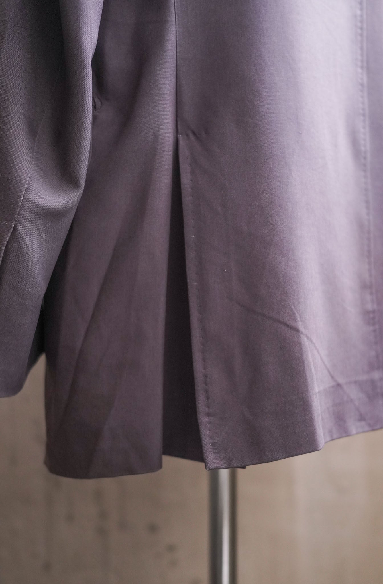ナチュラルショルダーから流れ落ちる程良い太さのアーム、開き見せの袖。