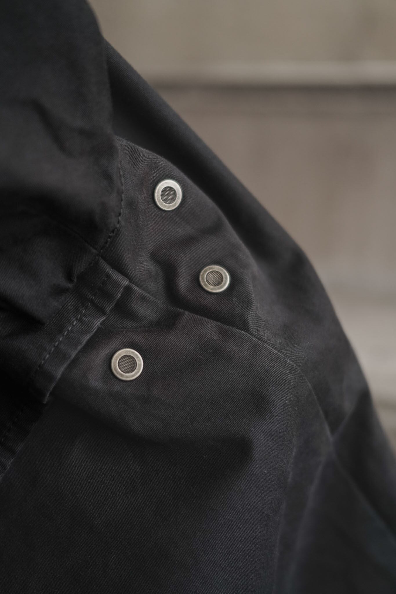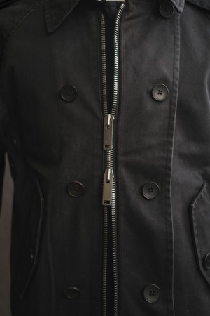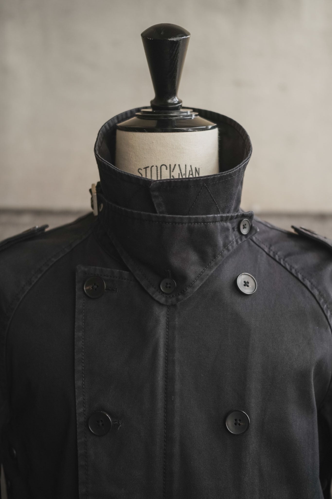 トレンチコートをベースにしたギミックの効いたデザインは権威的で非常に力強く、首元のチンストラップに始まり、エポレット、ベンチレーションにダブルブレストの仕様と溢れんばかりのギミックを搭載。