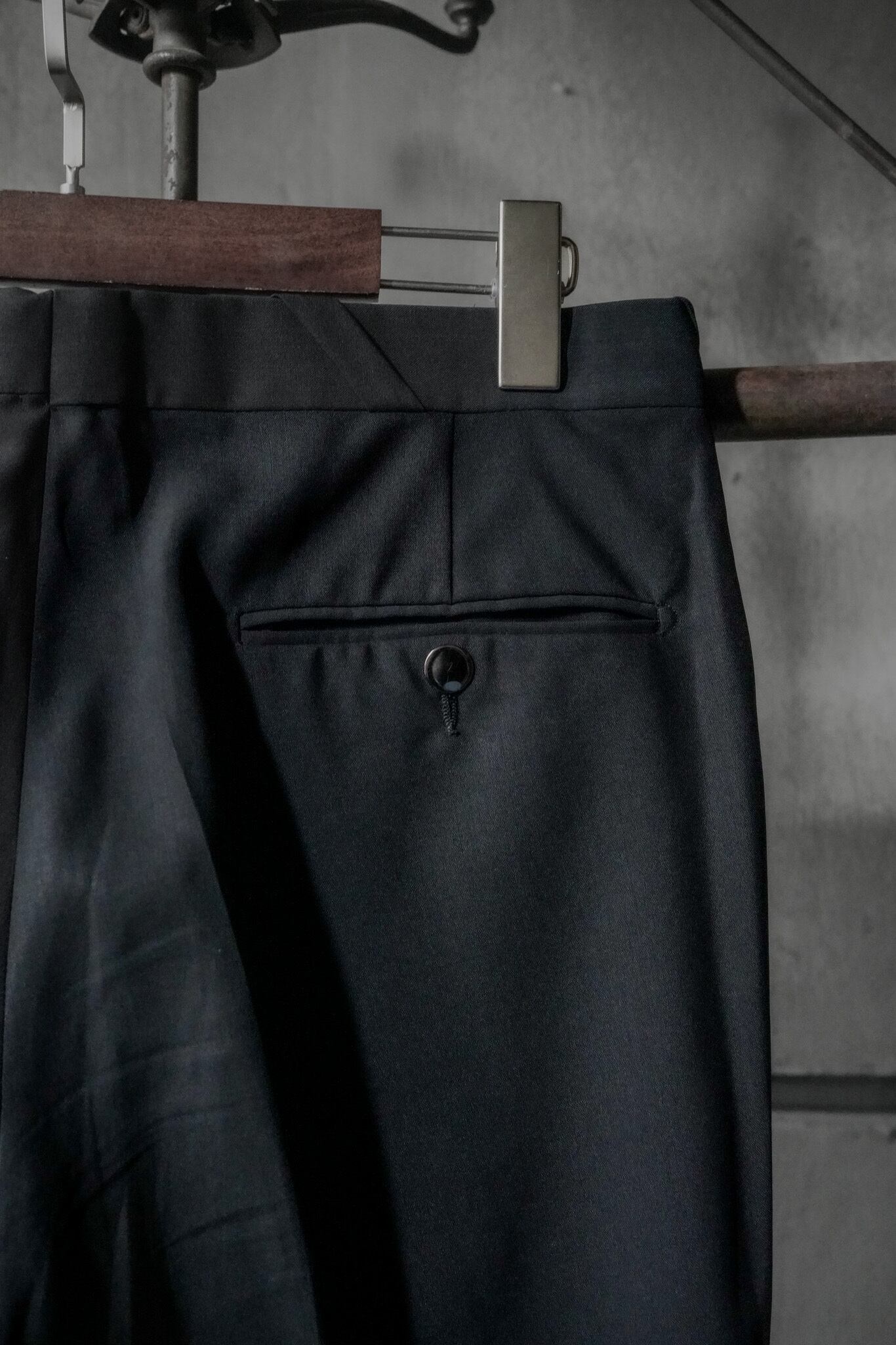 イタリア製の上質なウール地は、品格のあるマットな質感とほどよいハリを備え、スーツ全体の構築的な印象をさらに引き立てます。