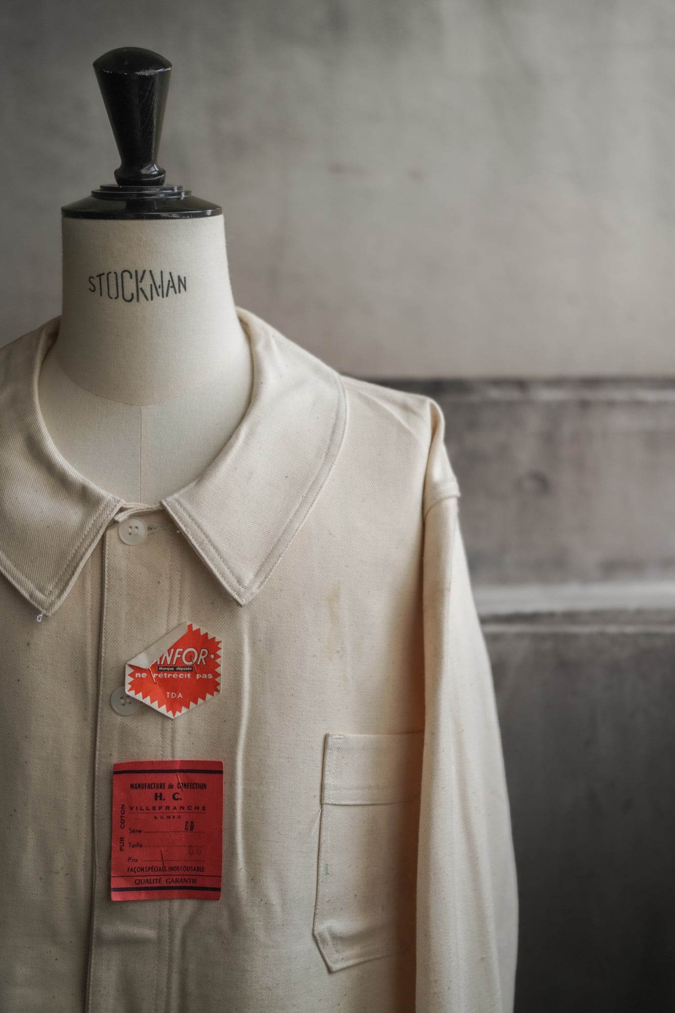 丸みを帯びた大ぶりのラウンドカラー、3ポケット+胸のツールポケットというクラシックなディテール、そして当時の赤タグと"Sanfor(防縮加工)"処理済みを示すシールも残った、最高のコンディション。