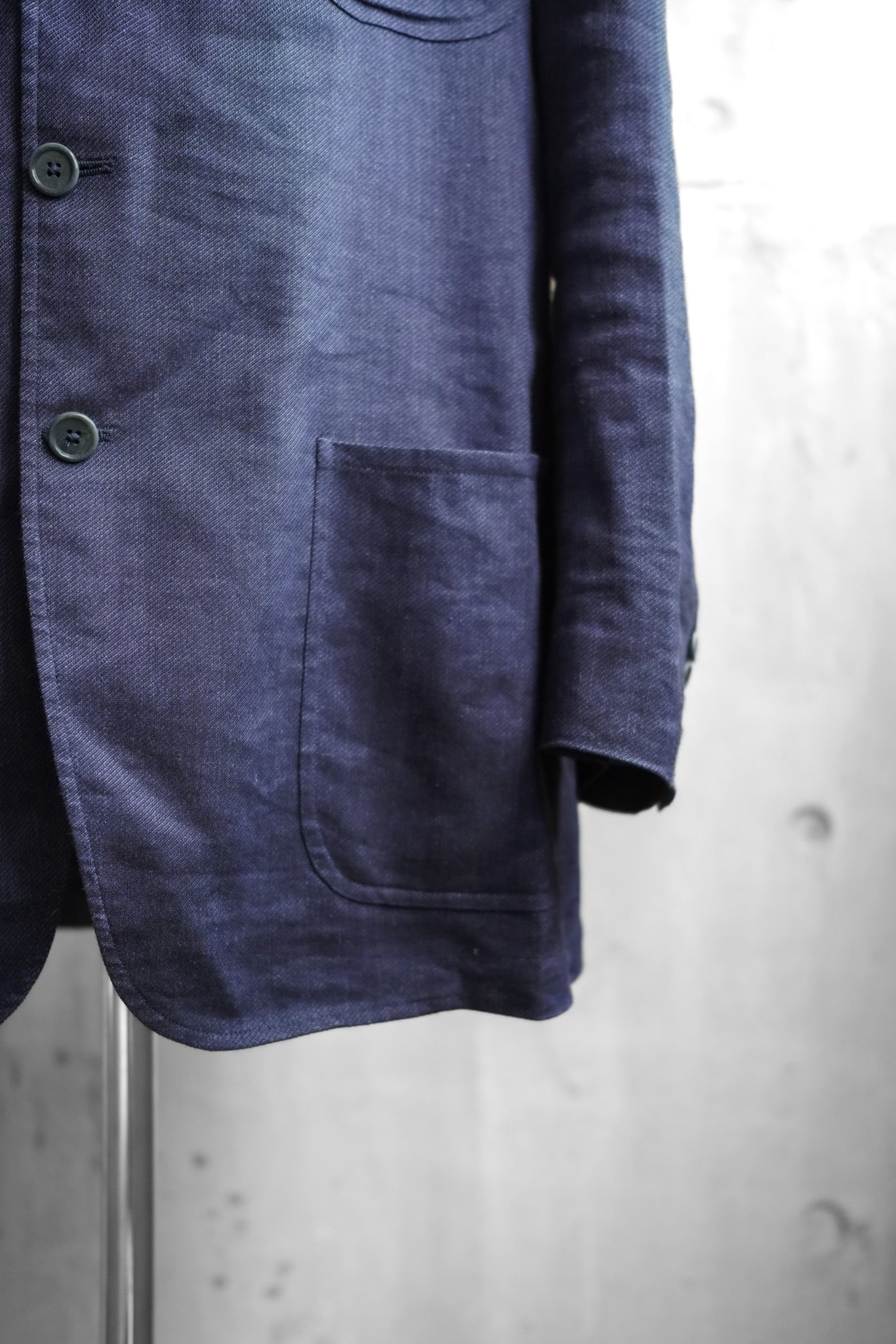 また、深く染め上げられた青は、昼間には紫がかったニュアンスを見せ、夕暮れには落ち着いたネイビーへと移ろうような、奥行きのある色調です。