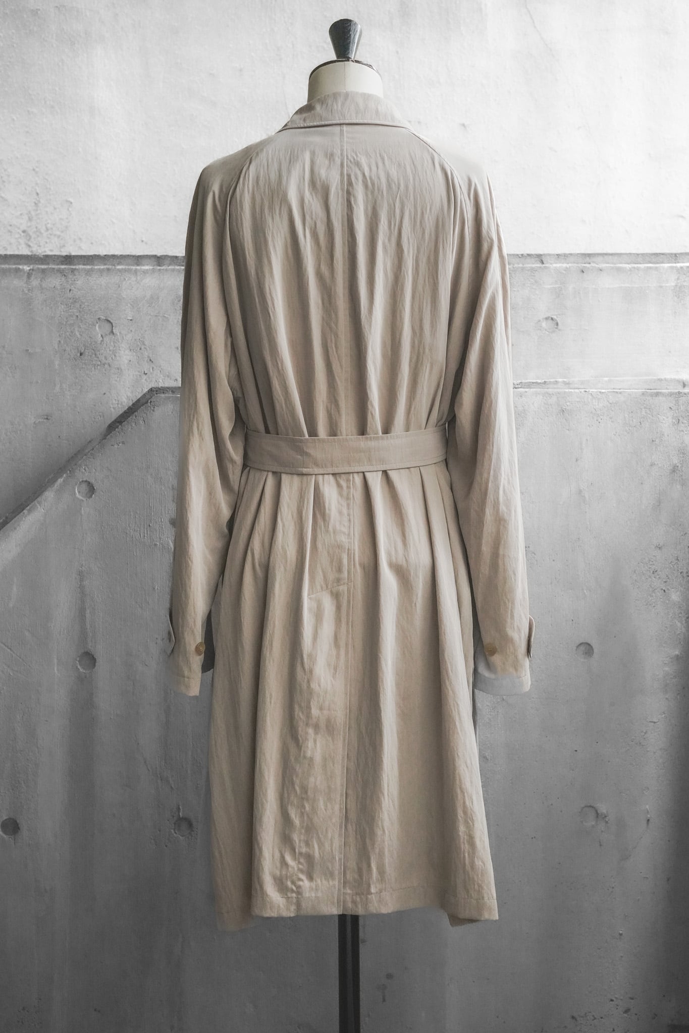 こちらは1990年代に生産された、モダール×ナイロン素材を用いたバルマカーンコート。バルマカーン(バルカラー)とは、シンプルな比翼仕立てとラグランスリーブを特徴とするクラシックなコートデザインのひとつで、イギリスの伝統をルーツに持ちながら、allegriの手にかかることでより軽やかで都会的に昇華されています。