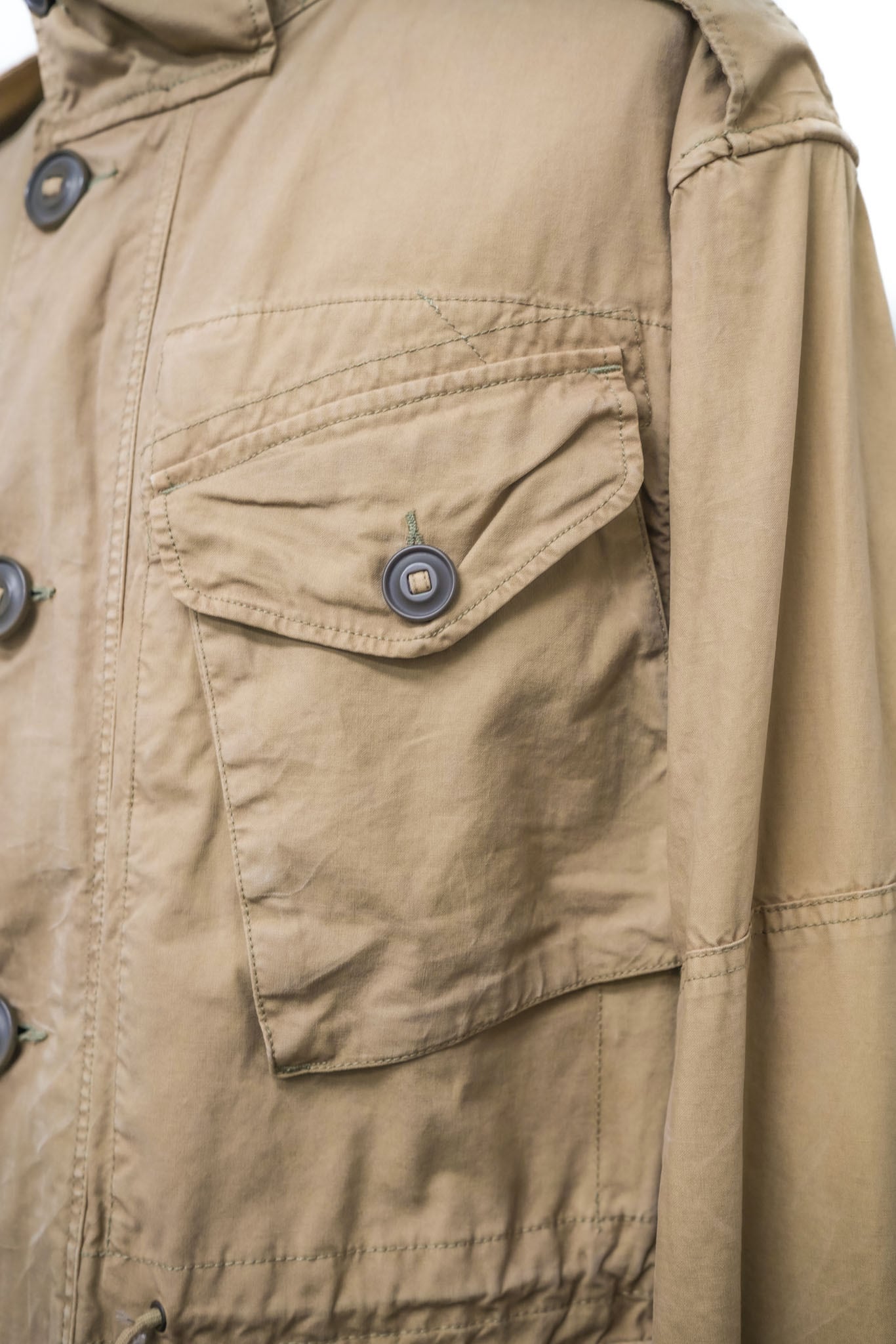 胸元に2つ、腰に2つ配置されたポケットは、英国軍の実物フィールドジャケットに倣ったもので、収納性とデザイン性を両立しています。