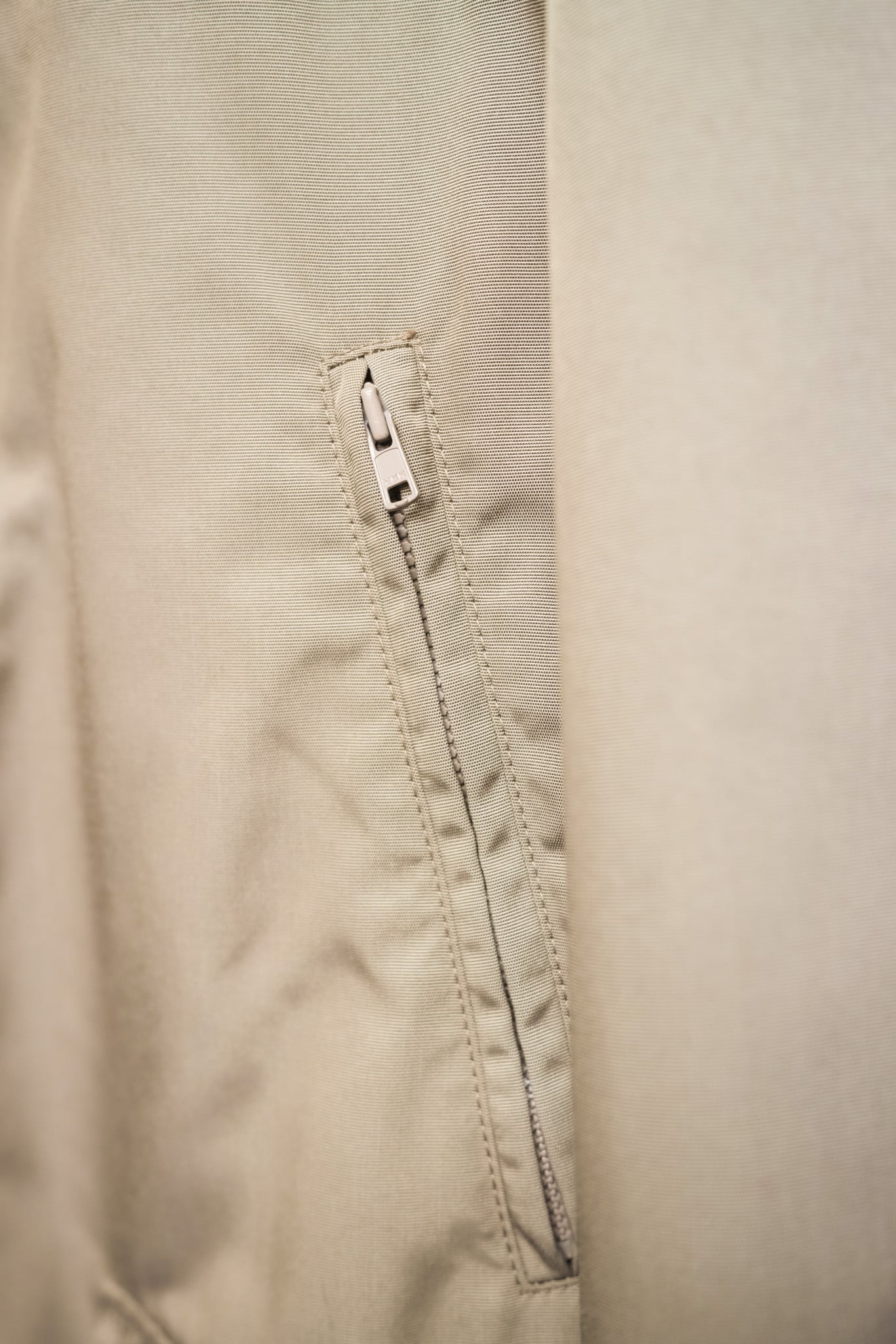 素材は程よい光沢を湛えた高密度のナイロンファブリックを用いており、雨風をある程度防ぎながらも軽やかな着用感を実現。