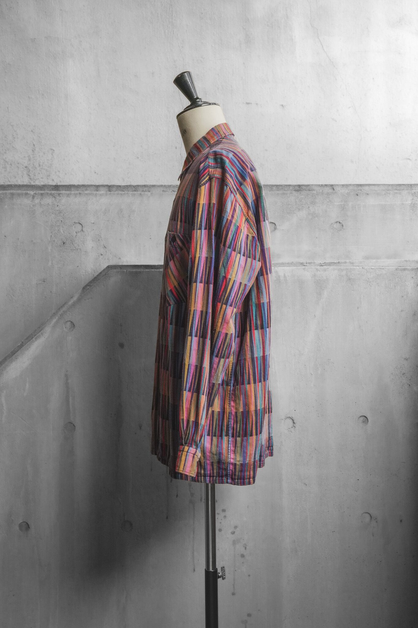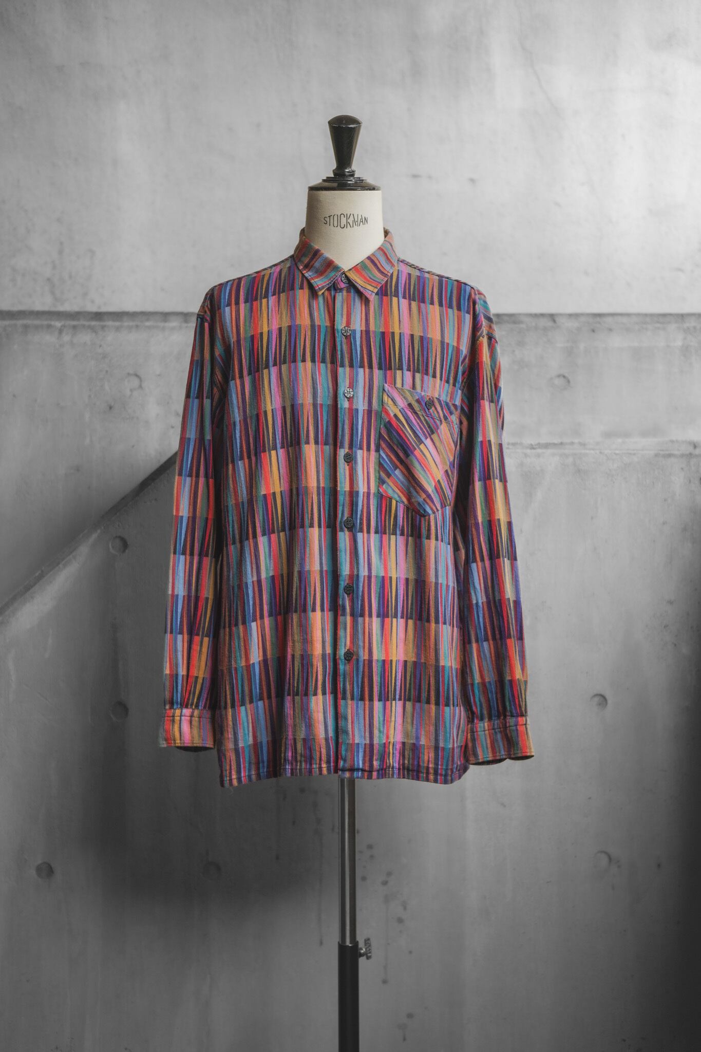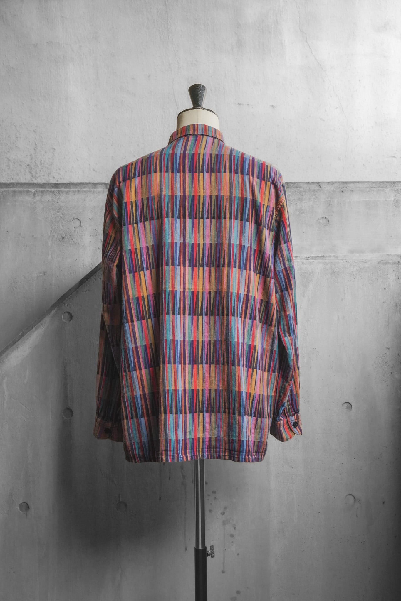 パターンは、ジグザグを思わせる縦の幾何学柄と色とりどりのストライプを組み合わせたもので、ブルー・オレンジ・パープル・レッドといった多彩な色彩が調和し、まるで抽象画のような奥行きを生み出しています。
