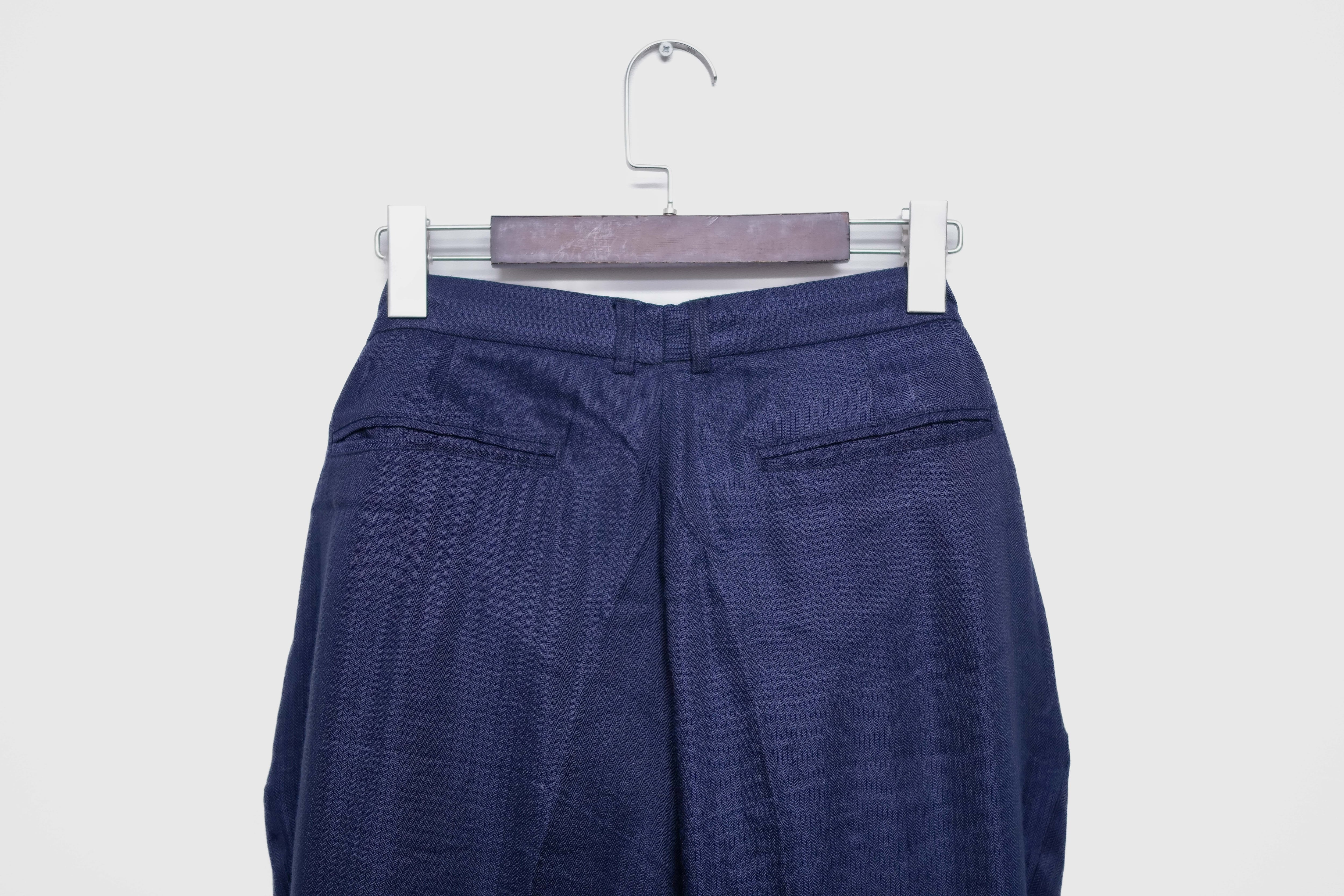 本品は、深みのあるネイビーリネンを用いたトラウザーズ。軽やかで通気性に優れたリネン特有の素材感を生かしながらも、アルマーニらしい落ち感のあるシルエットが特徴です。程よいワイドストレートのラインが、動きに合わせて自然なドレープを描き、着用者の所作をエレガントに演出します。