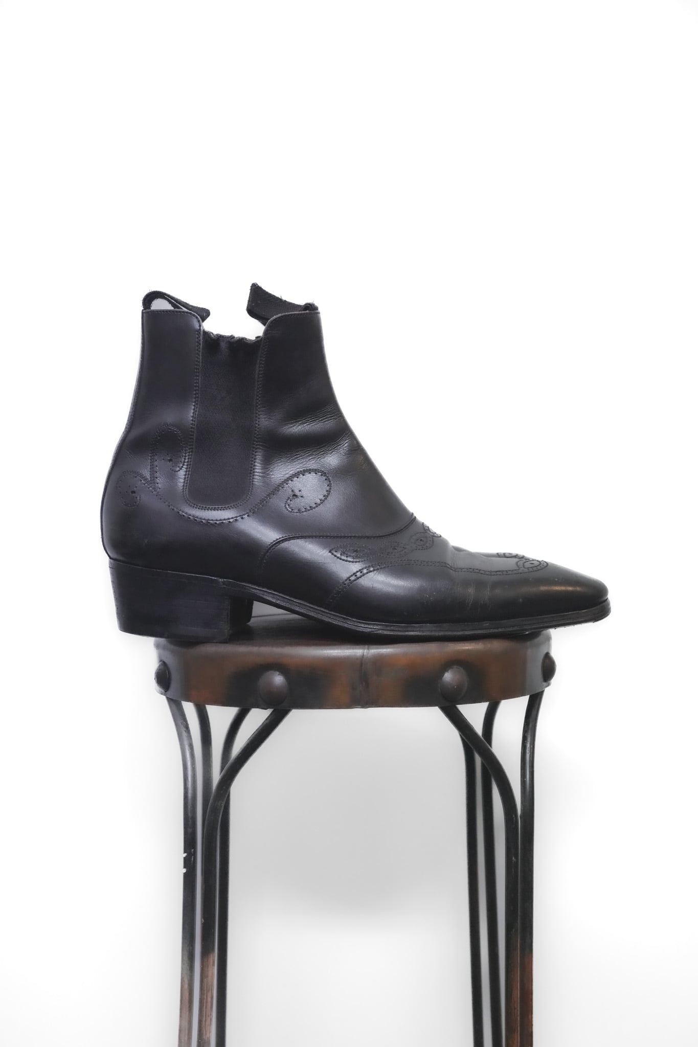 黒カーフの深度、細身ラストの緊張、メダリオンの控えめな装飾。