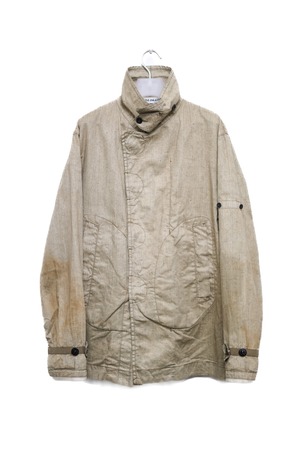 リネン地の表面に樹脂系コーティングを施す技法を採用し、天然繊維ならではの通気性と、コーティング由来の防風性・適度な撥水性を併せ持つ一着です。