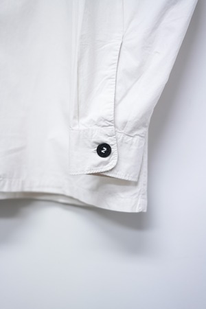 生地は軽やかなコットン100%。高密度に織り上げたポプリン調の風合いで、ハリを保ちながらもソフトなタッチが特徴です。ホワイト一色で潔く仕立てられ、ガーメントの陰影が際立つミニマルな佇まい。