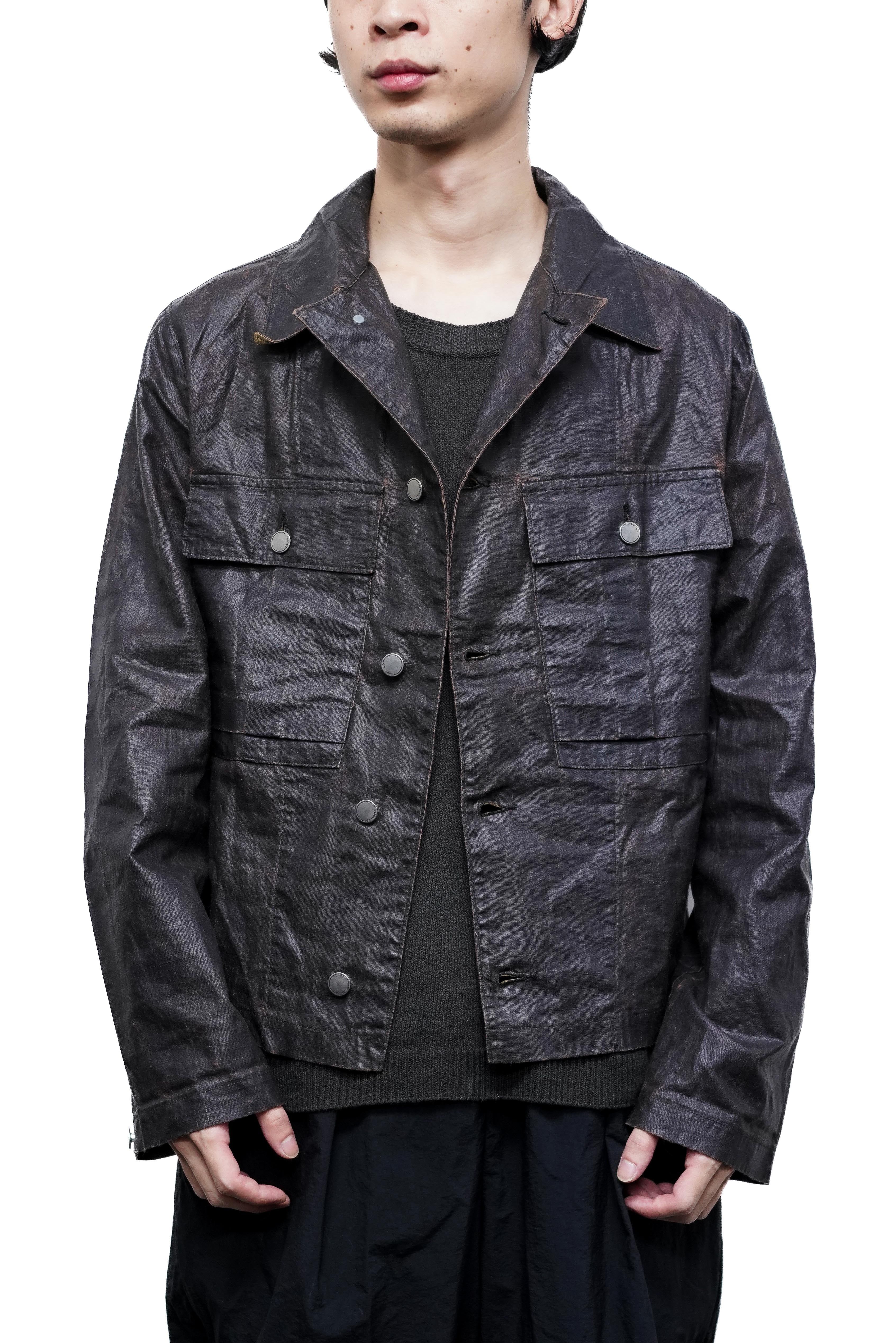 本作は2002年春夏に登場した“LINO-FLAX”ファブリックを用いたジャケットで、ブランドの技術的アプローチを最も素直に体現する一着でございます。