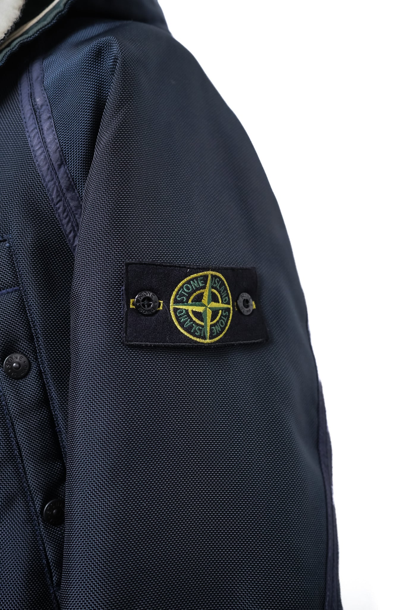 高密度に織り上げたナイロンを製品染めで深いネイビーへと発色させ、縫い代やステッチ周りに生まれる陰影がストーンアイランドらしい工業美を強調します。