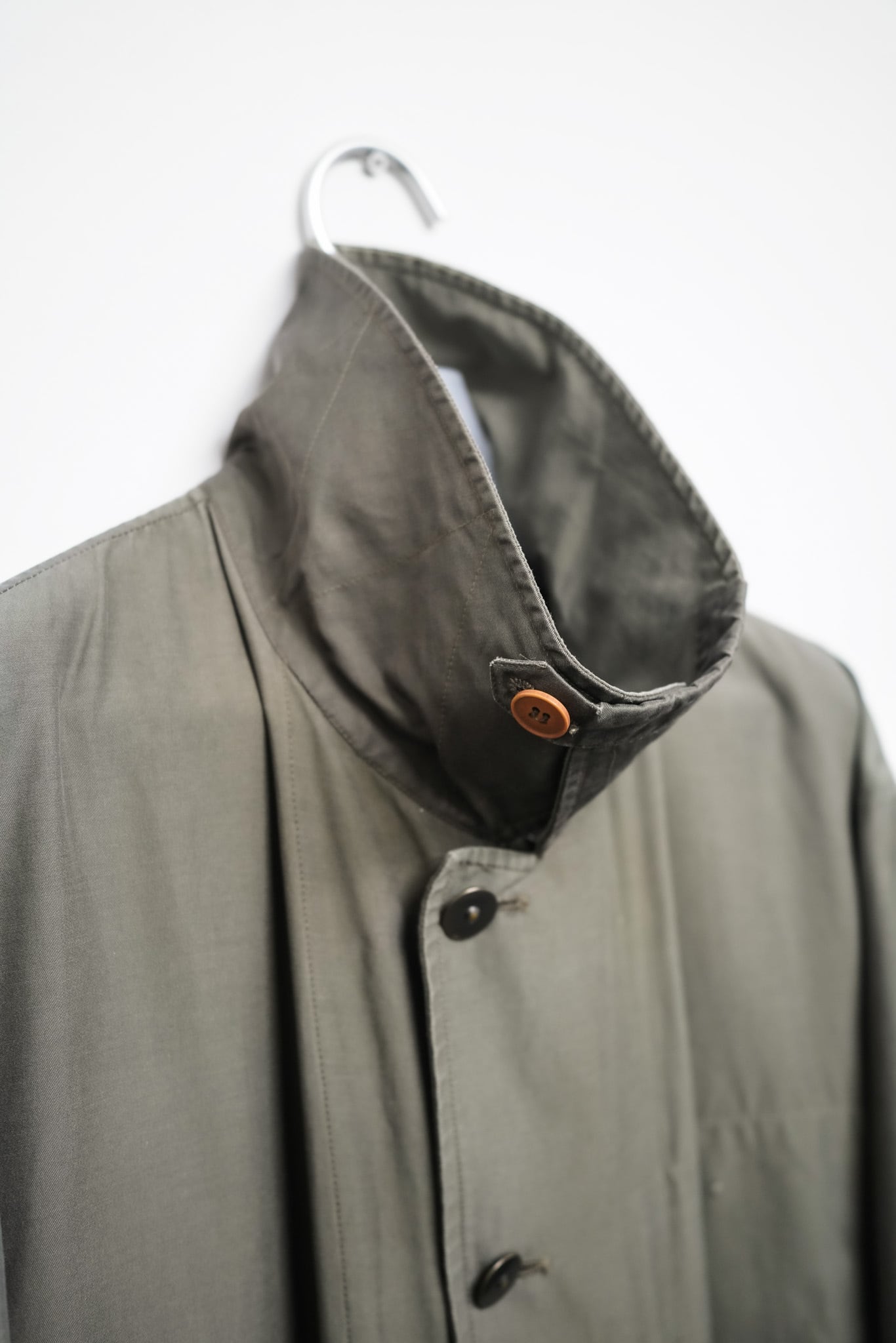 デザインはシンプルながらも構築的で、比翼仕立てのフロントと低めの襟、立体的な袖付けが織りなす美しいAラインシルエットが印象的。