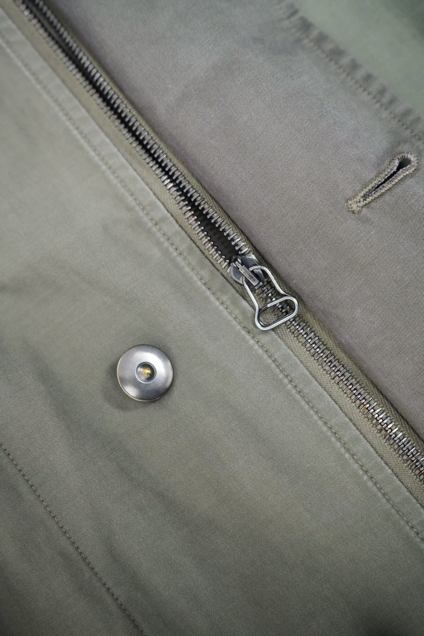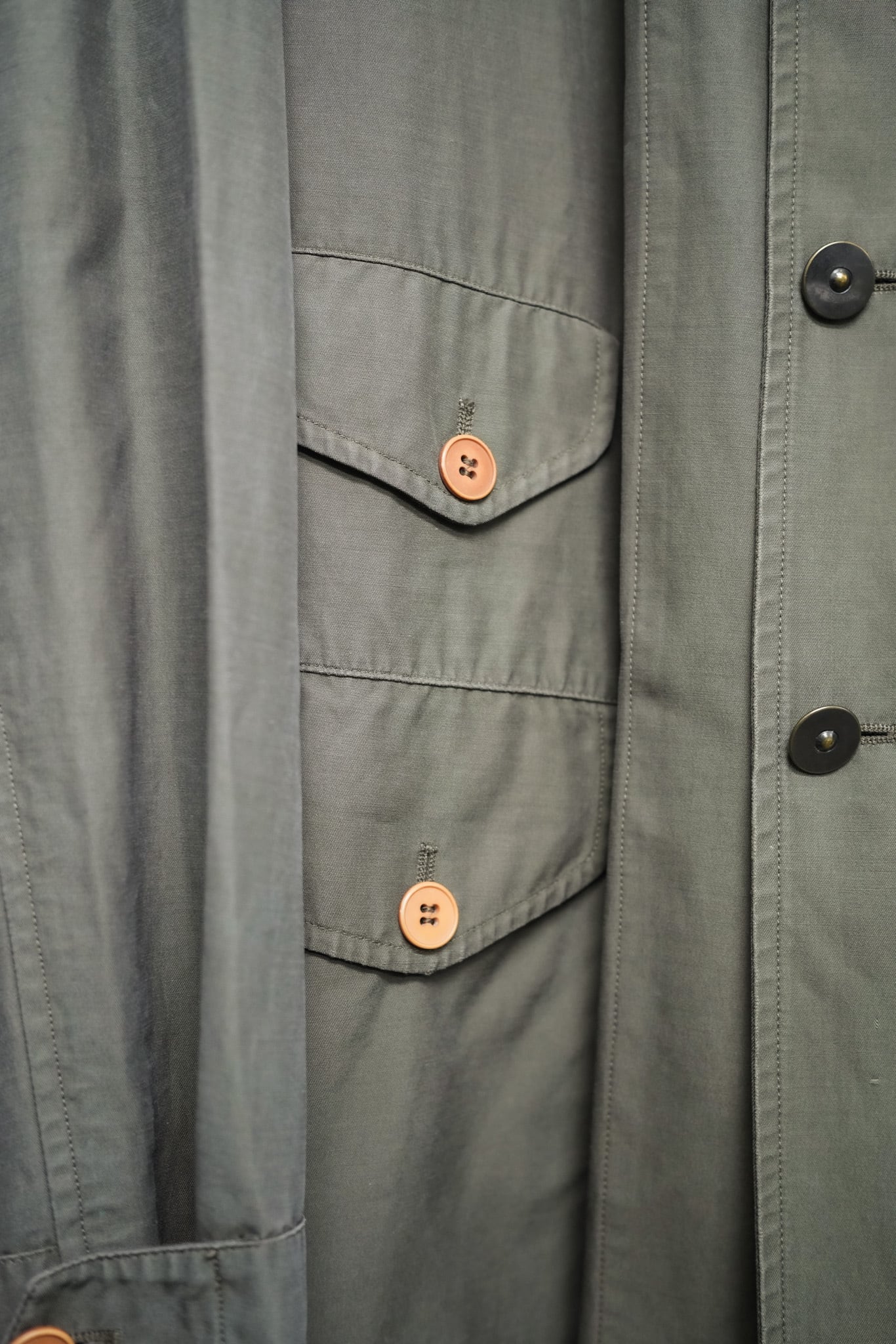 左右に配置された3つのフラップポケットは、ハンティングコートを思わせるクラシカルな意匠ながら、全体は極めてクリーンにまとめられています。