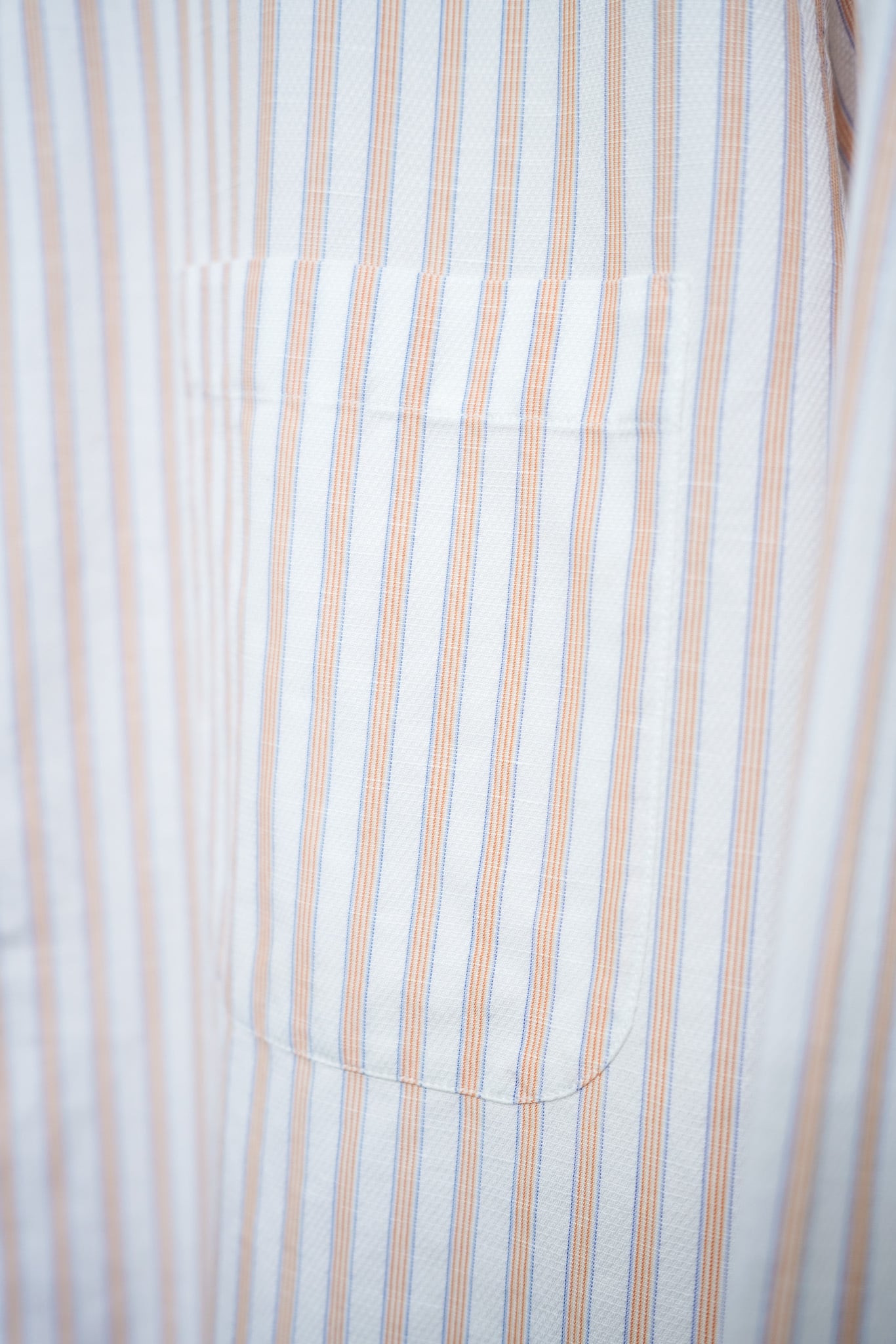 ホワイトをベースに、オレンジベージュと淡ブルーの細ラインを重ねたストライプは、華美にならずに清涼感と上品さを演出。