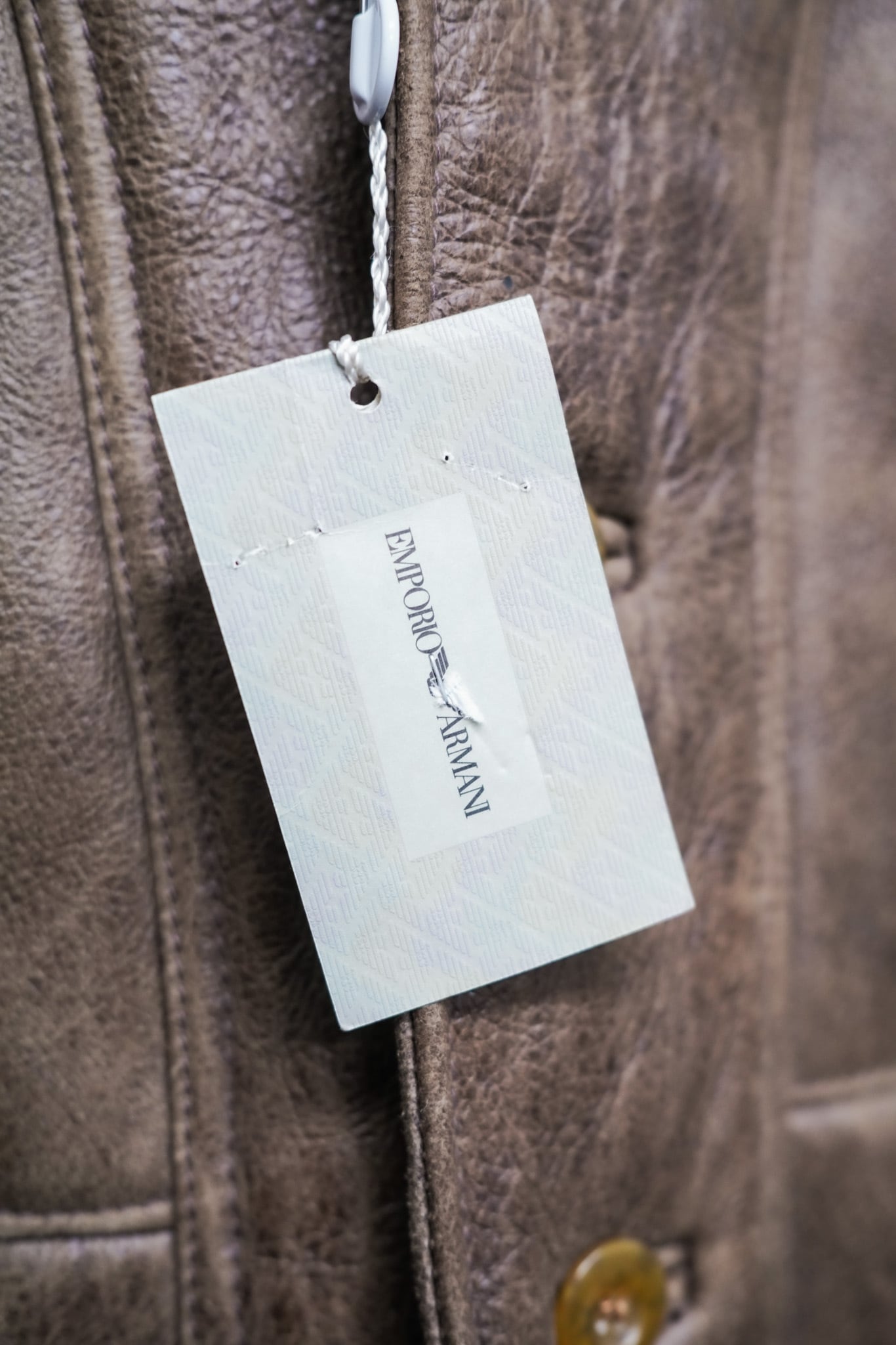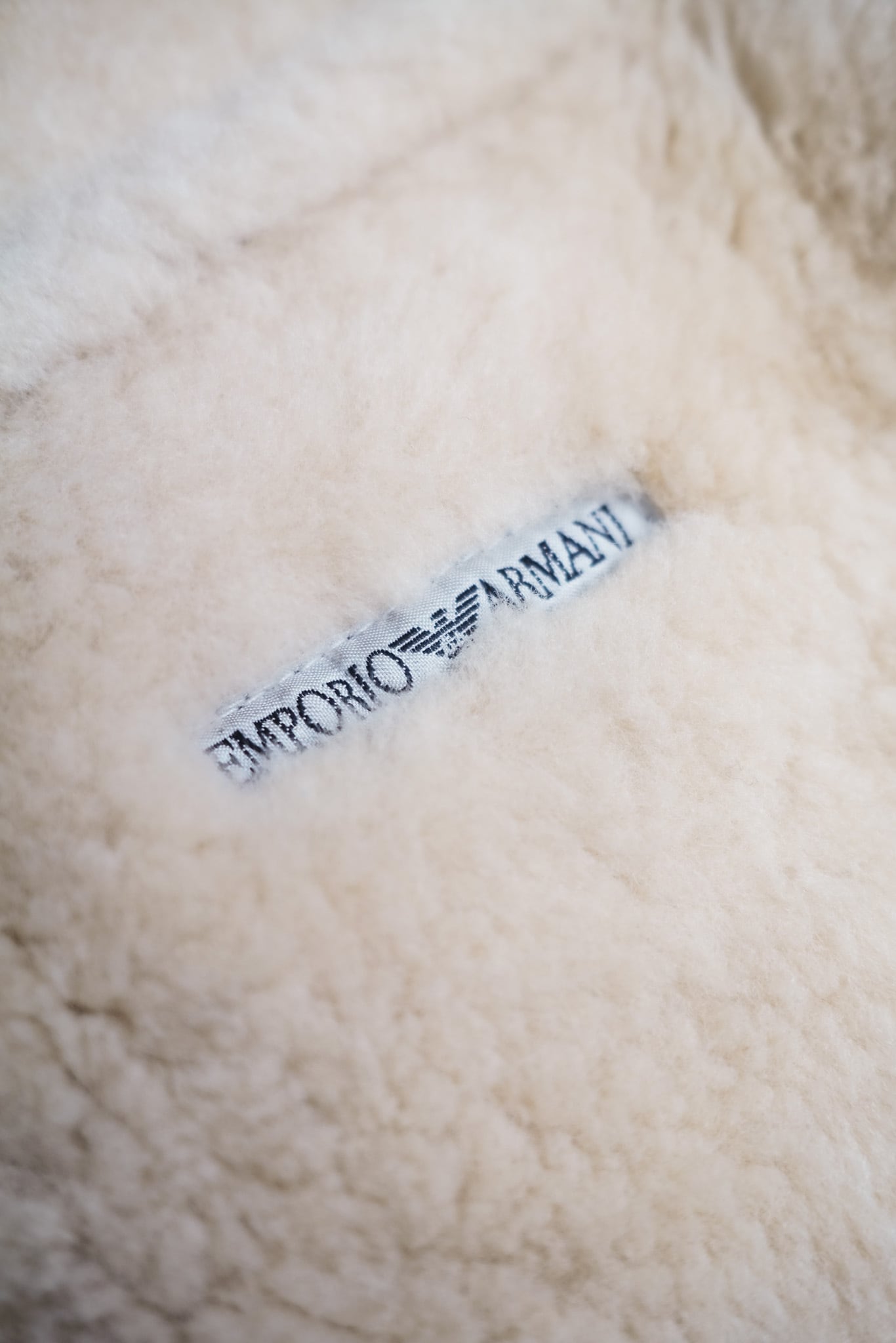 胸ポケットの控えめな配置や、直線的でクリーンなパネル構成は、アルマーニの建築的アプローチを象徴しています。襟にはホワイトムートンを使用し、重厚感の中に洗練されたコントラストをプラス。