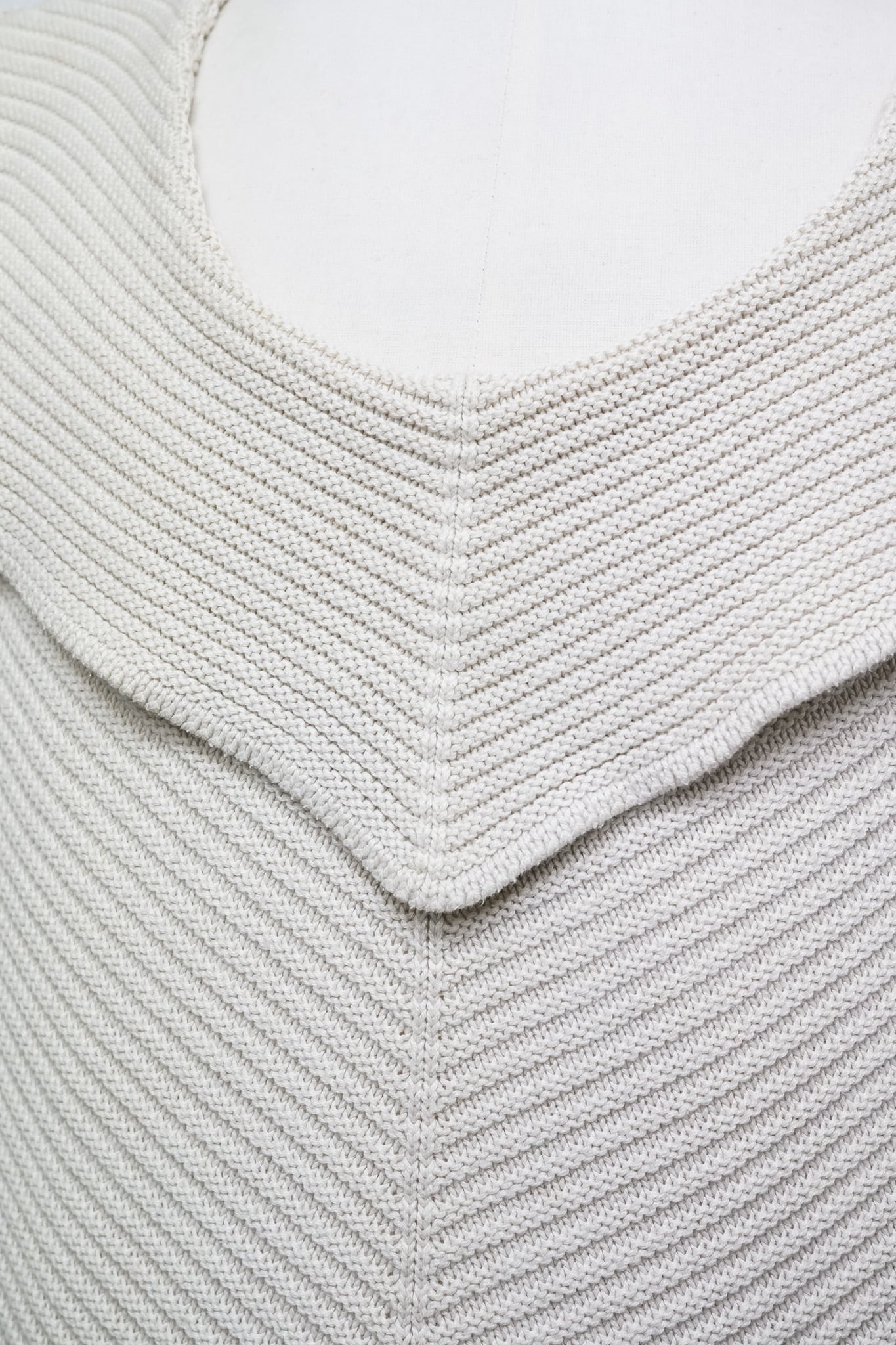 直線的なカッティングに頼らず、編地の方向性と落ち感を活かしながら、裾にかけて柔らかく広がる独特のドレープを形成しています。