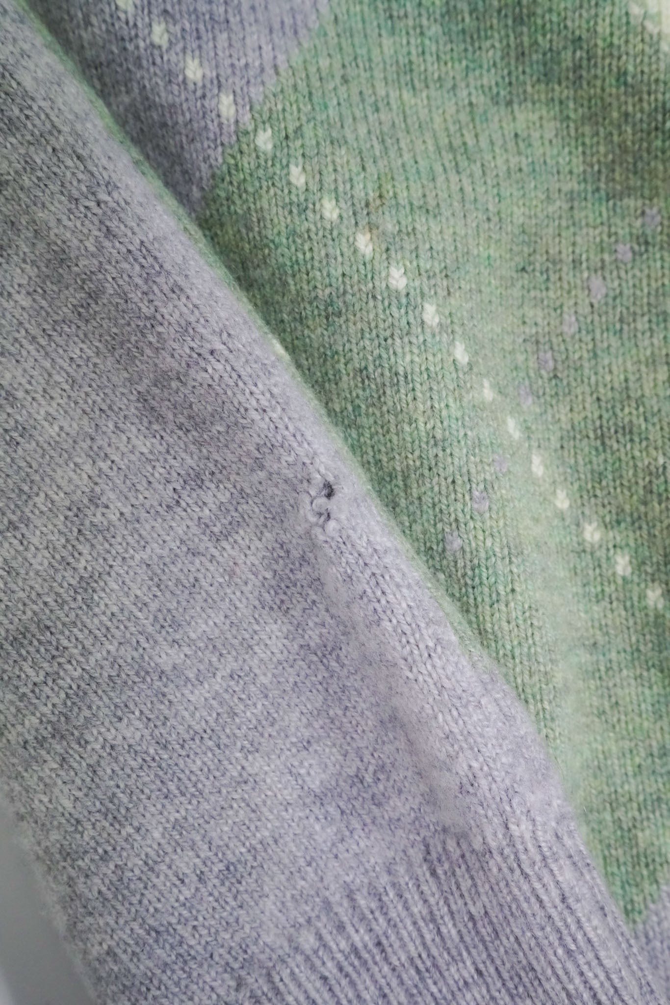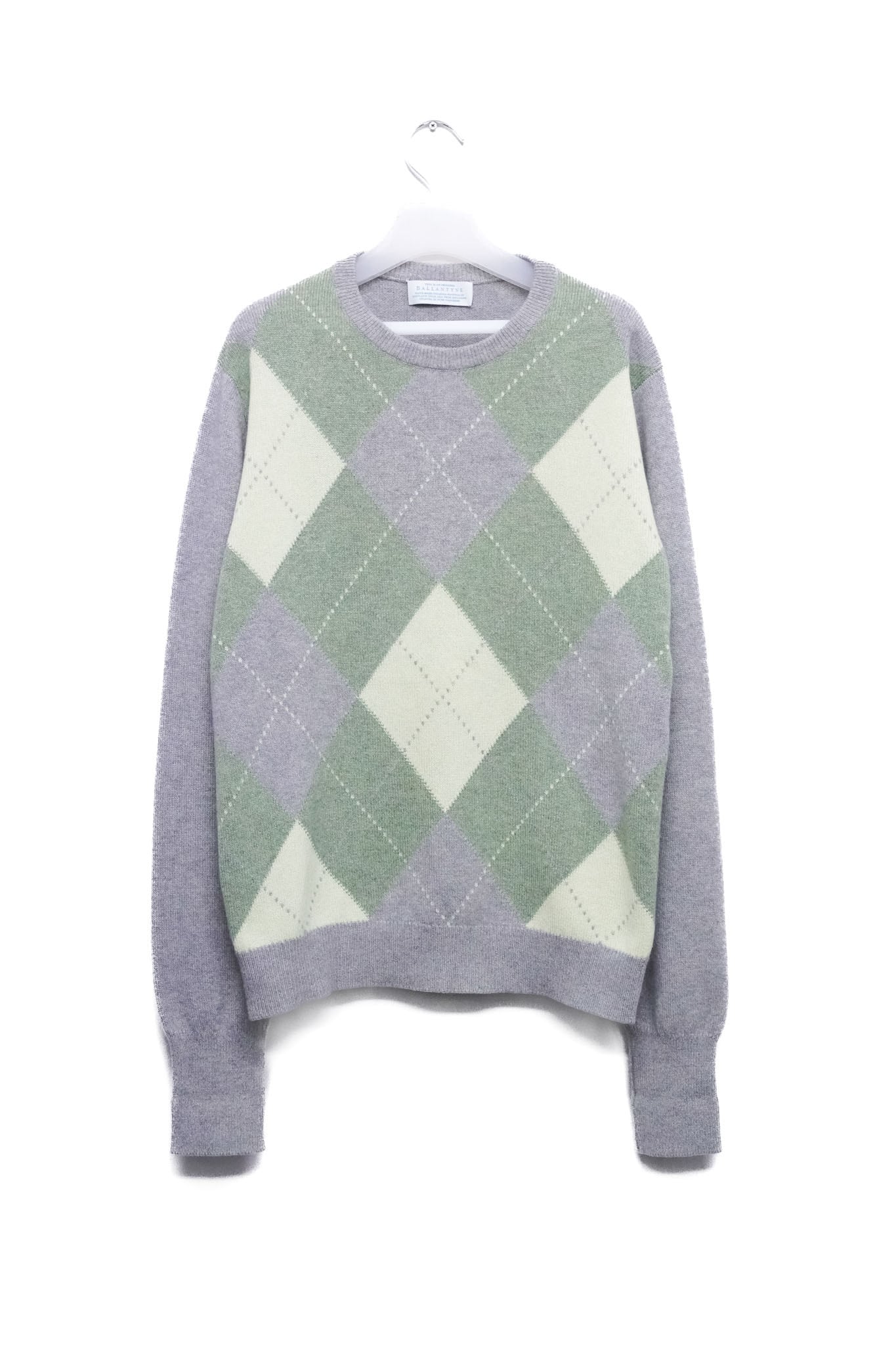 ライトグリーンとグレーを基調に構成されたアーガイルは、色の重なり方や濃淡の調整が極めて繊細で、上品ながらもどこか温かみを感じさせる仕上がりです。