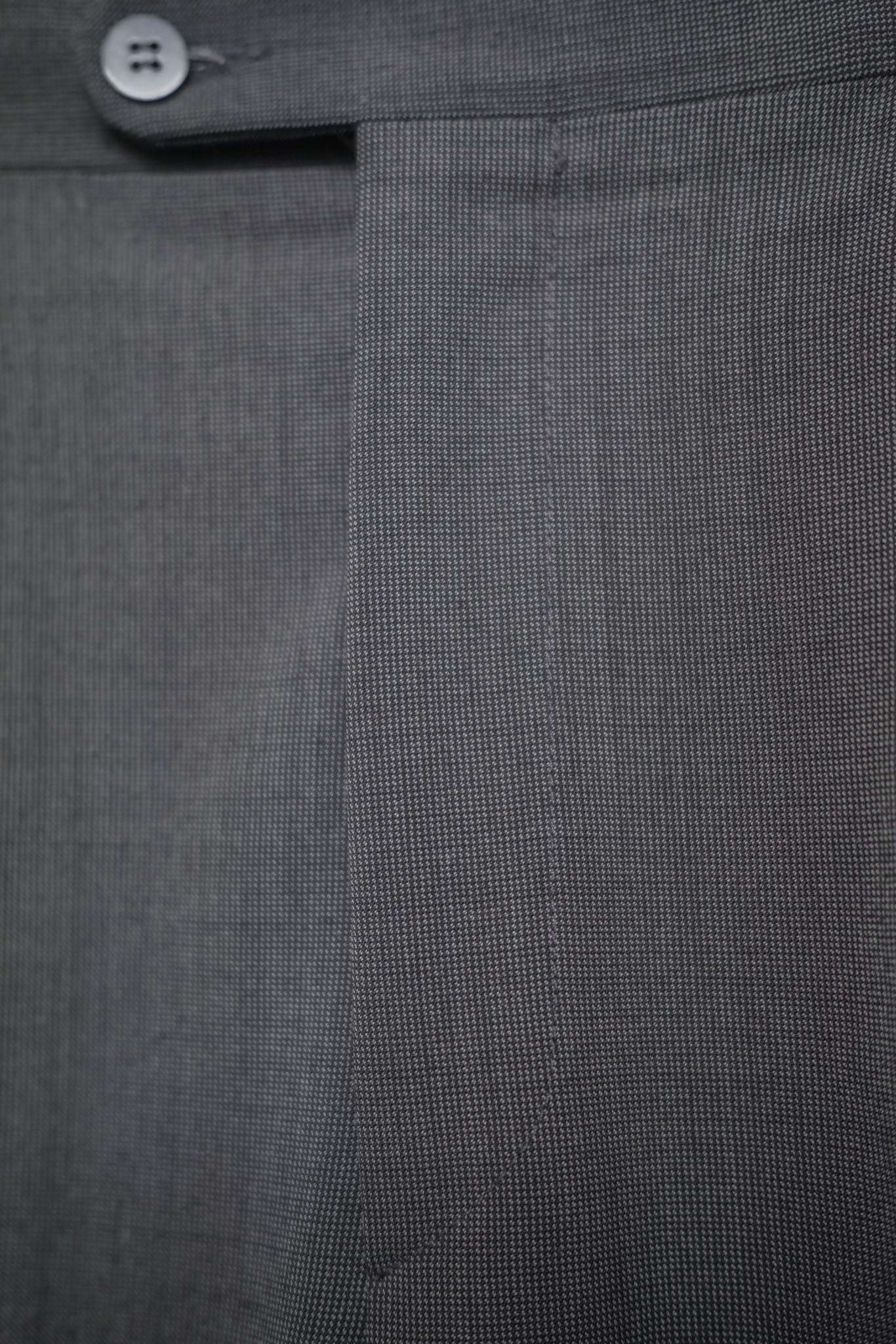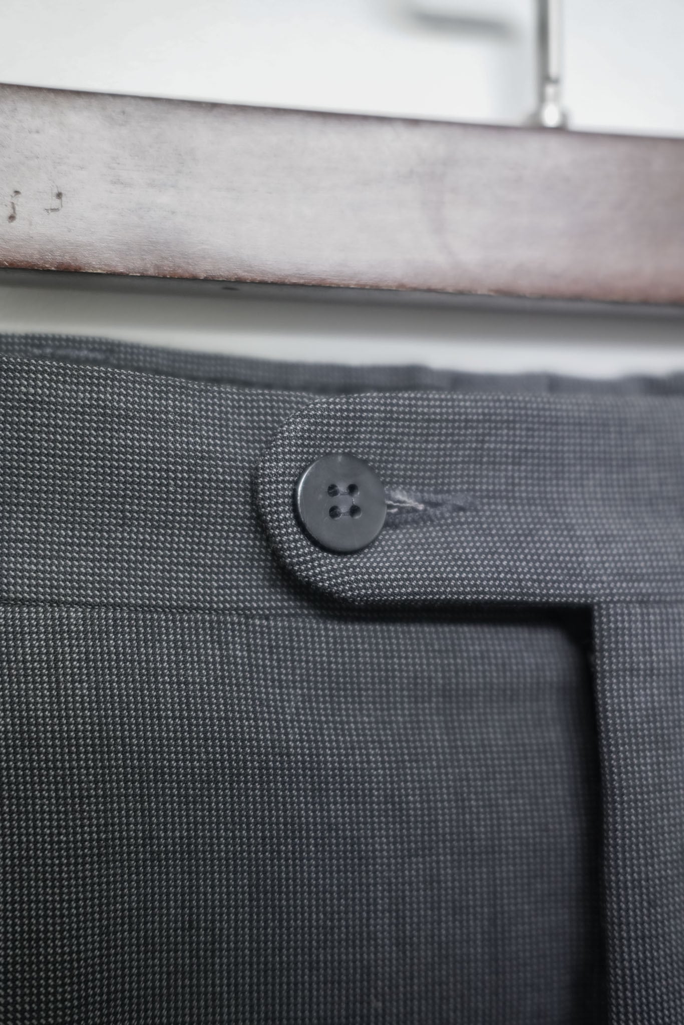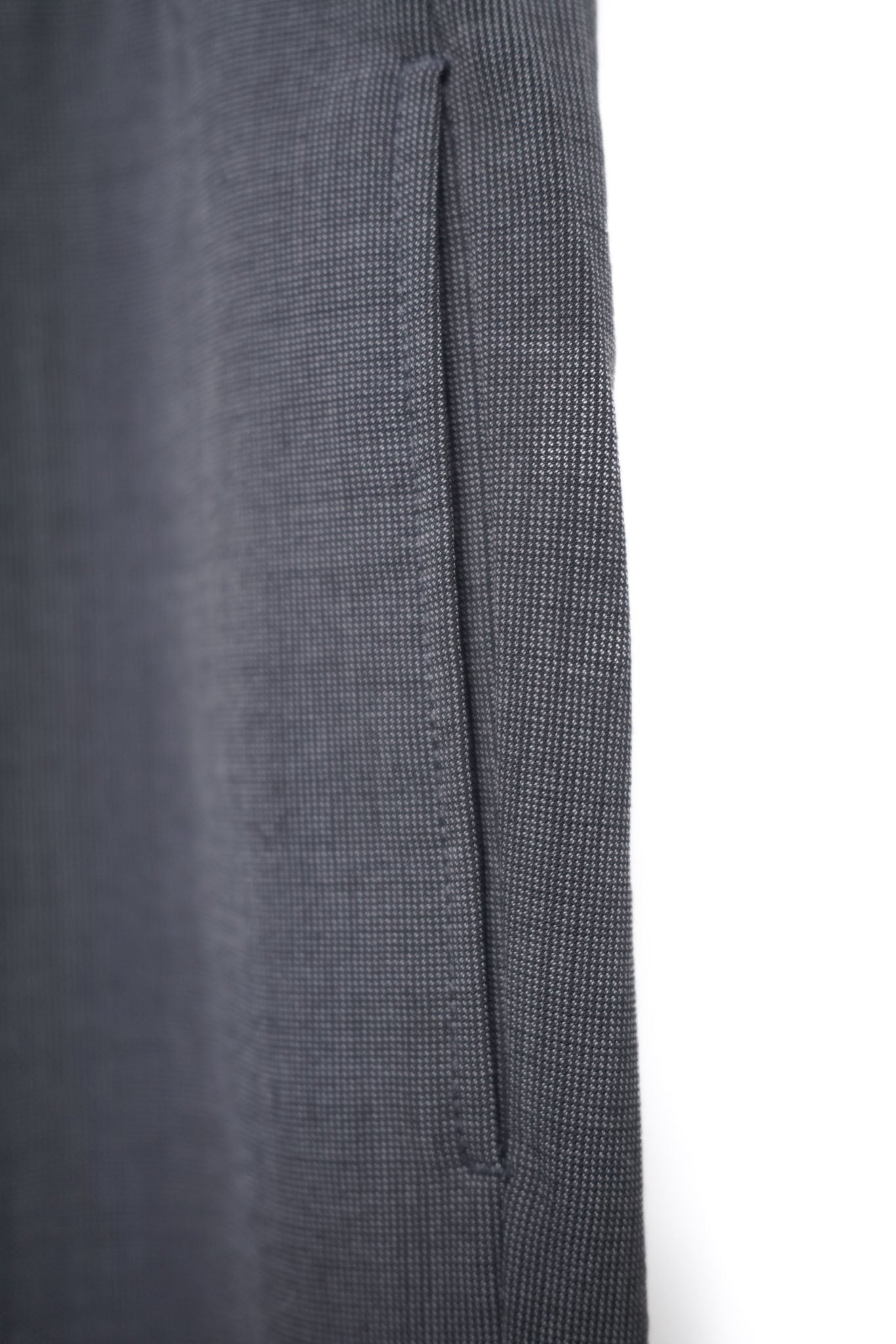 ドレス用のトロピカルウールとしては王道のグレーを採用し、細かな織りの陰影が上品なニュアンスを生み、スタイル全体を引き締める洗練された印象へと導いています。