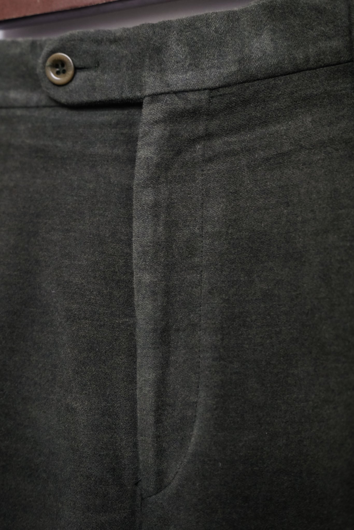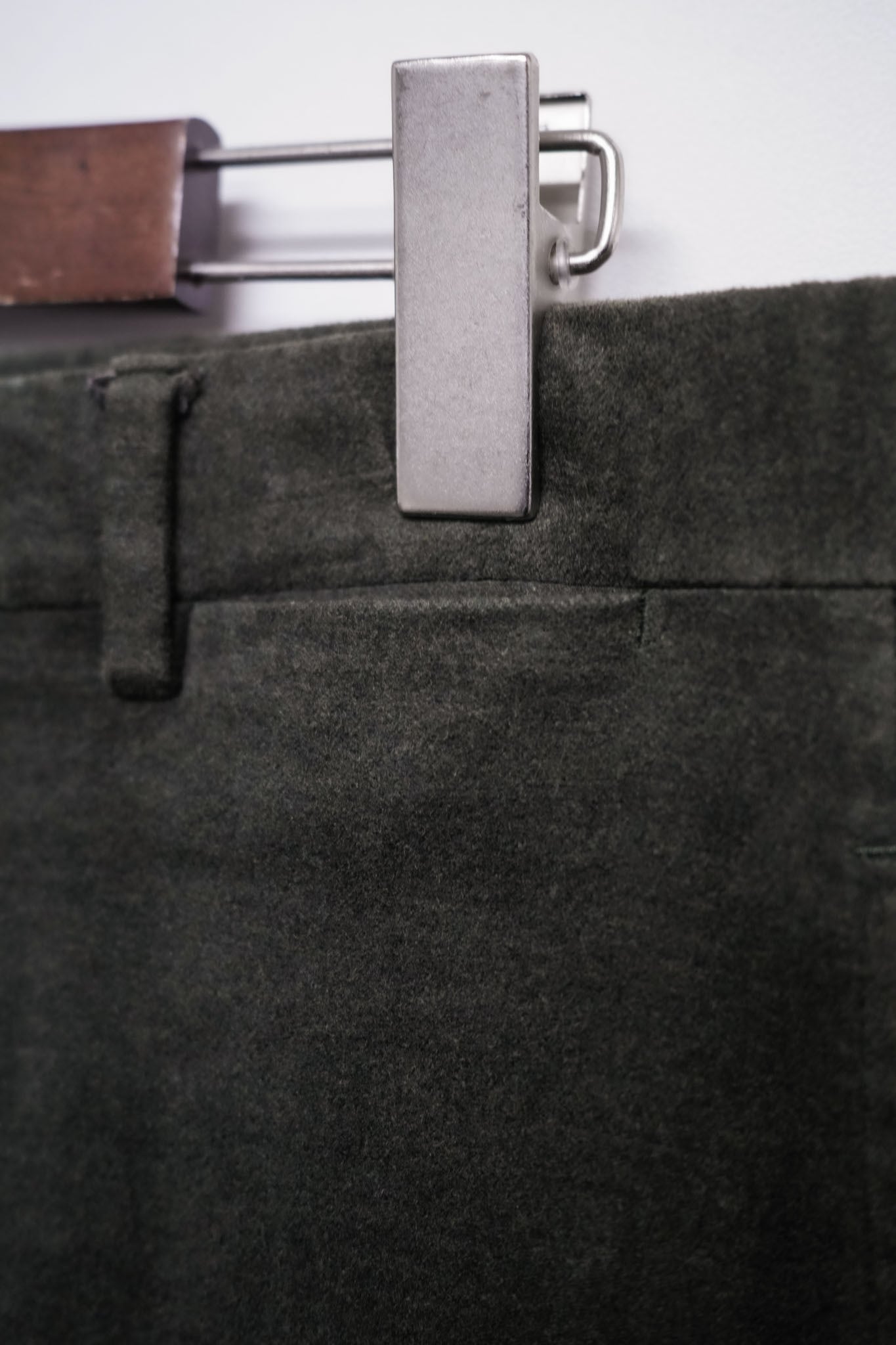 ベルベットやコーデュロイほどの主張はないものの、表面にわずかに残る起毛が陰影を生み、動きに合わせてさりげないニュアンスを見せてくれます。