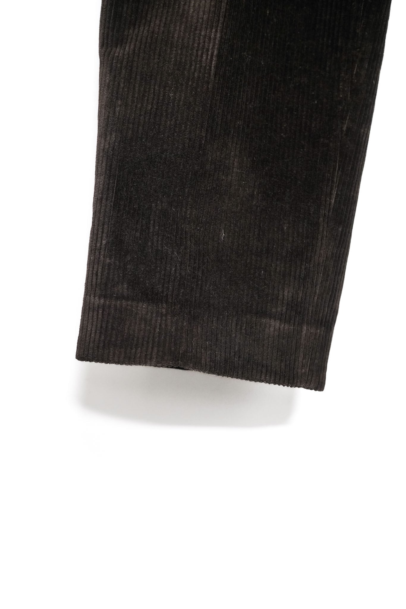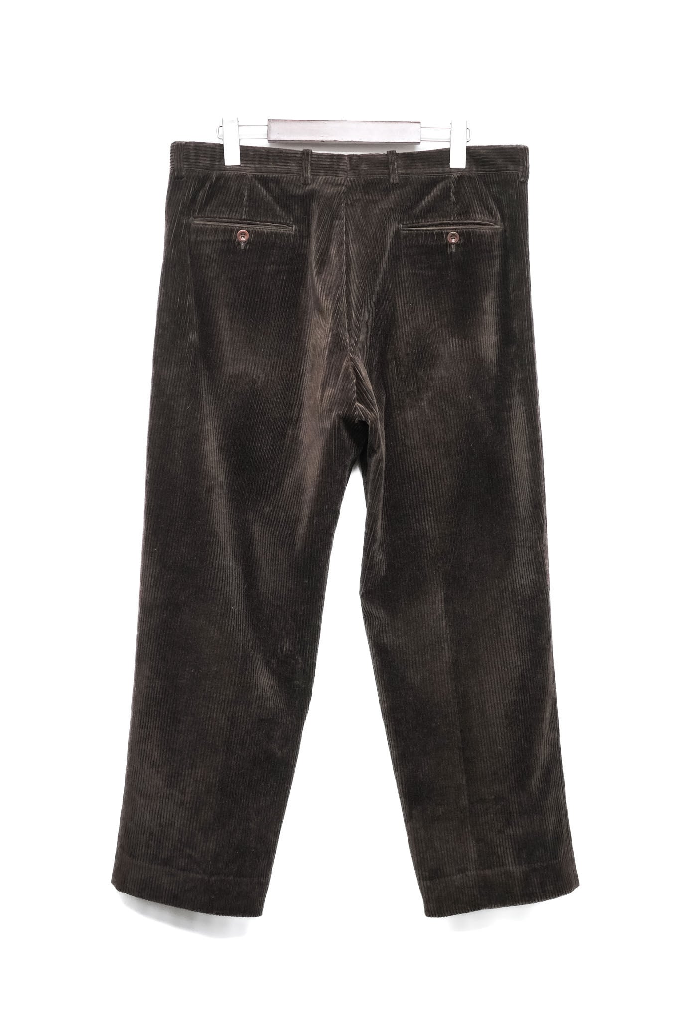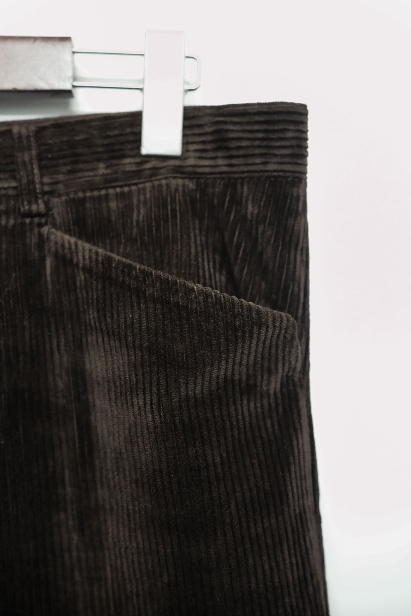 カジュアル化しがちなコーデュロイパンツを、モダンなドレスアイテムとして成立させるための重要なディテールです。