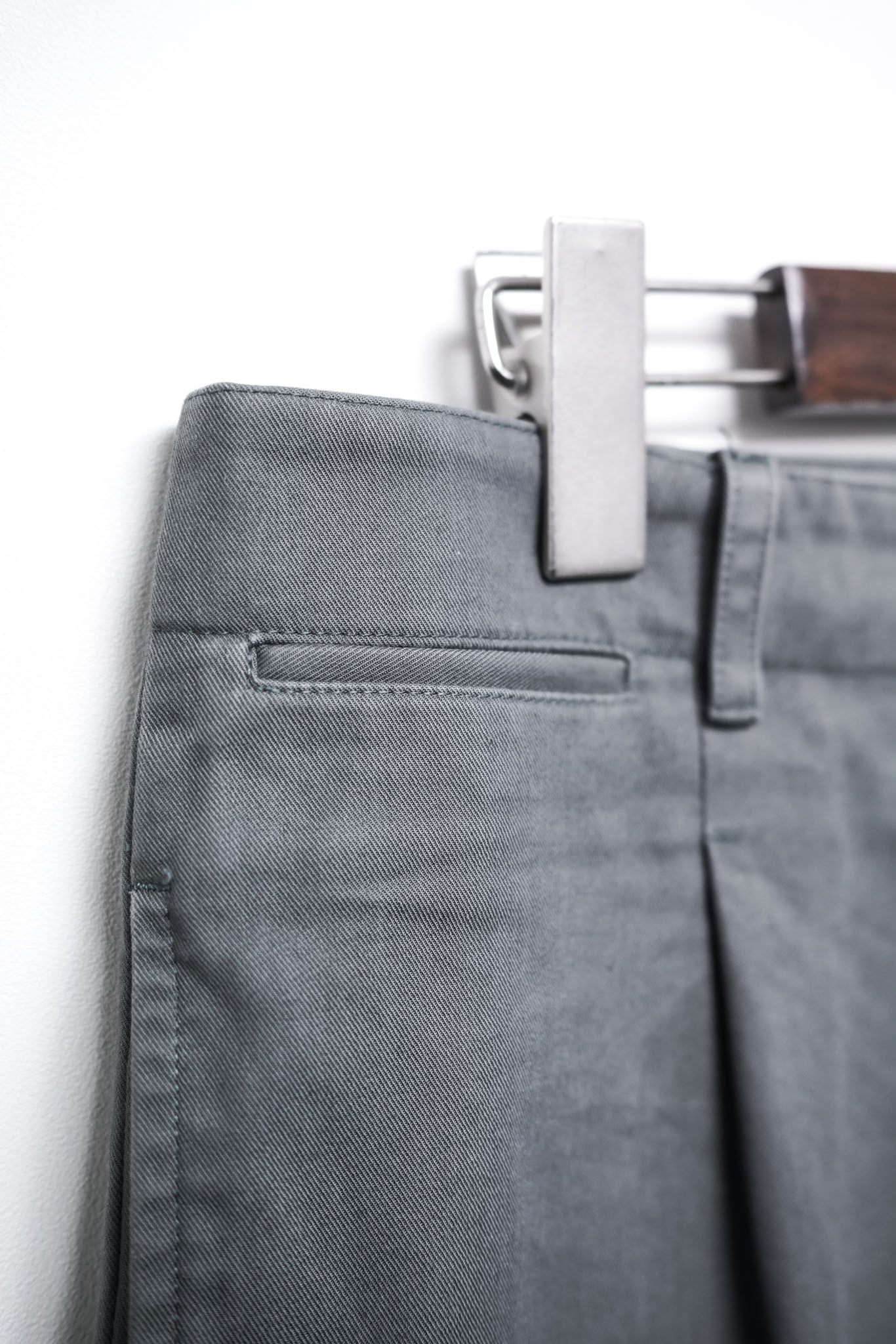 ポケットの玉縁、ボタンの質感、ステッチ幅の均一さ、ベルトループの細さに至るまで、語られることのない繊細な調整が積み重ねられています。