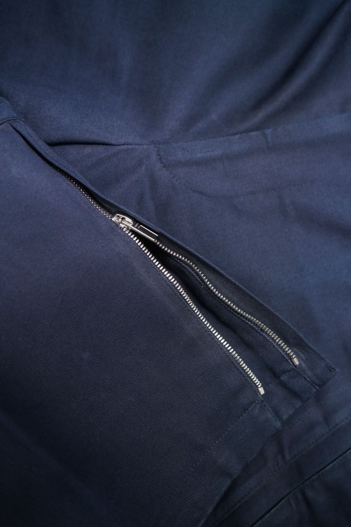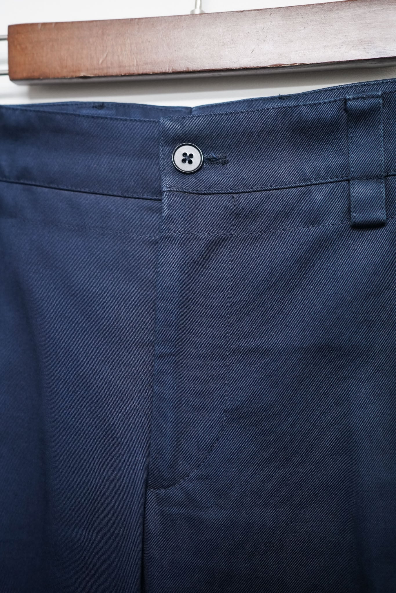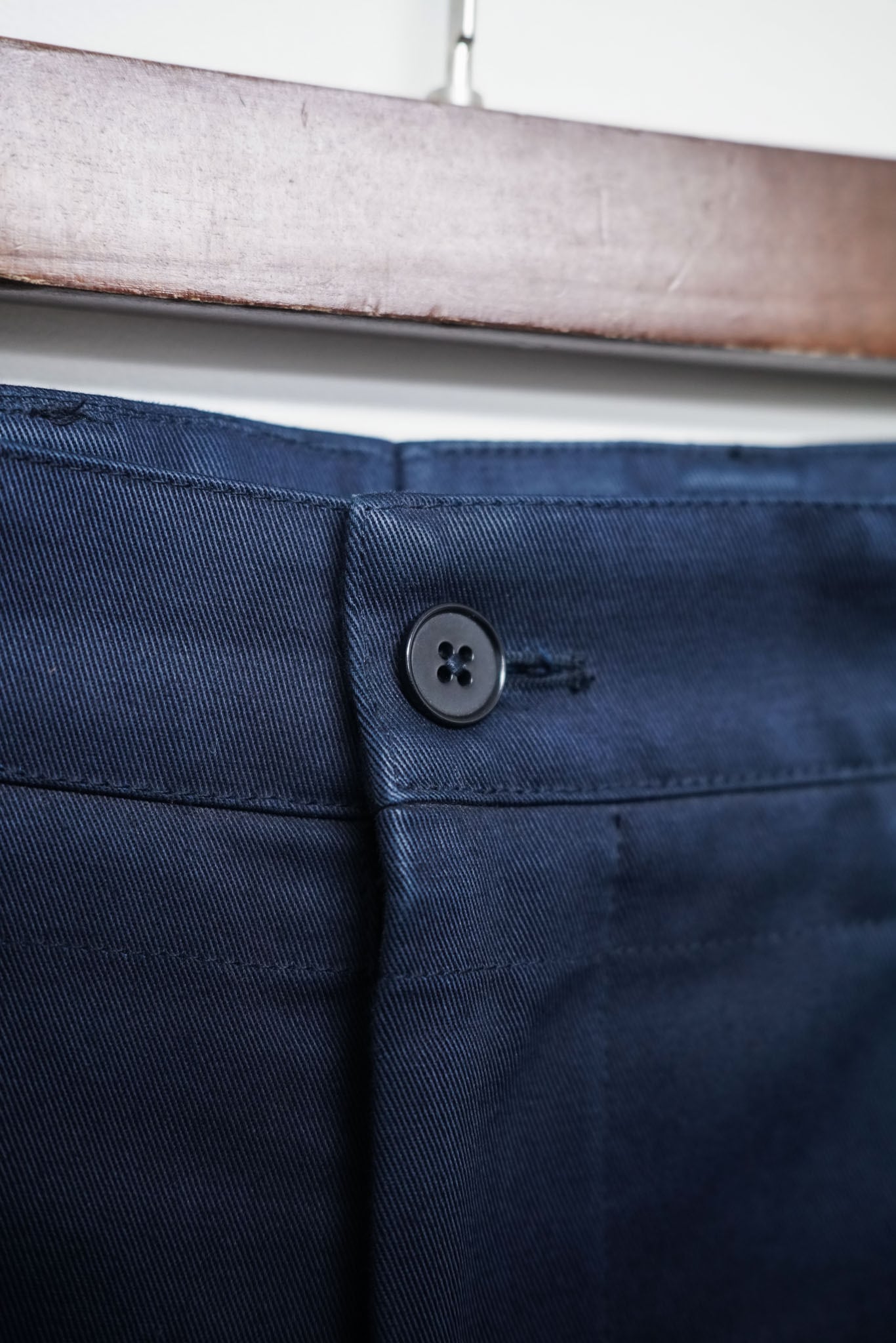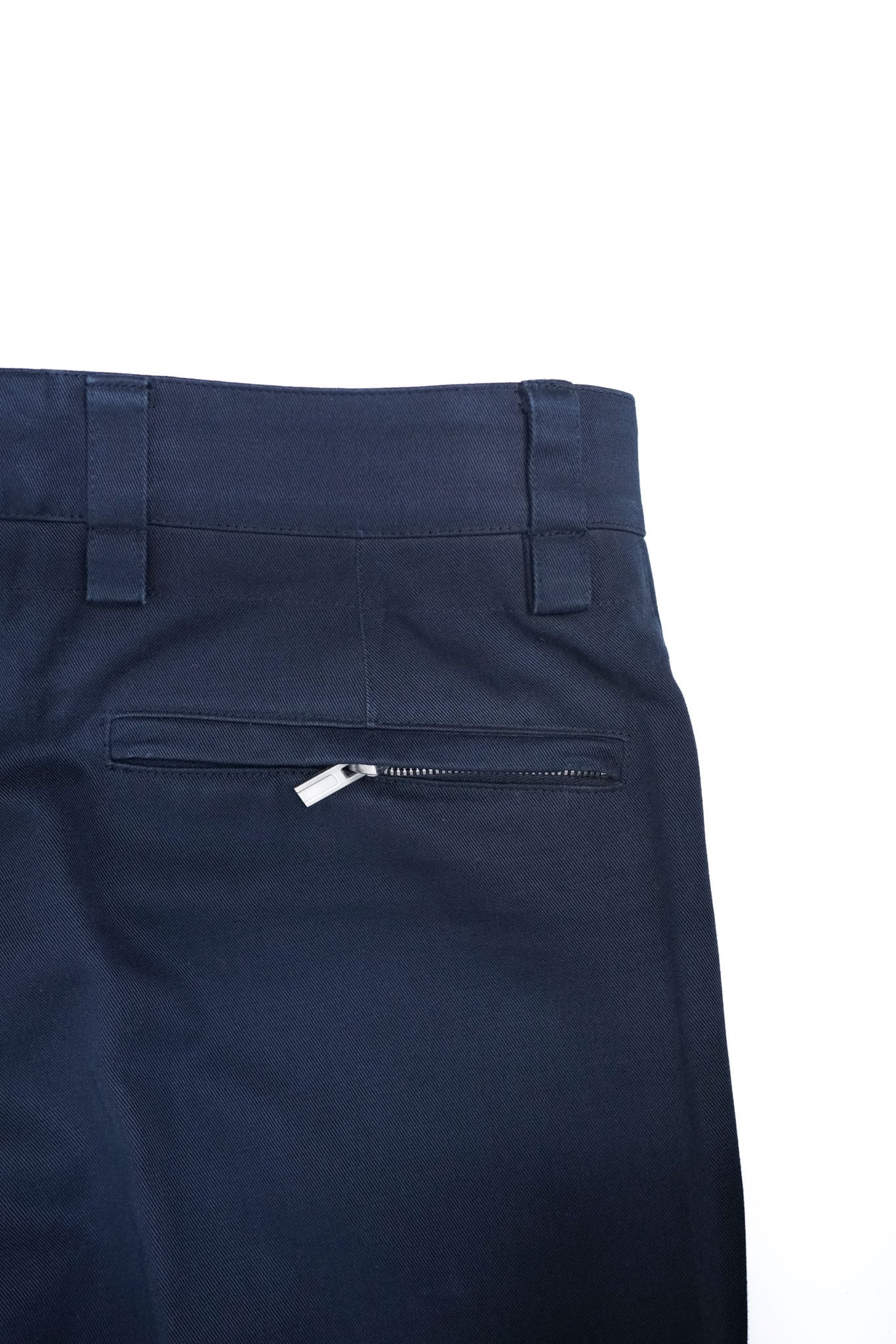 深いネイビーカラーのコットンチノ。その佇まいはクラシックでありながら、どこか都会的な軽やかさを纏います。