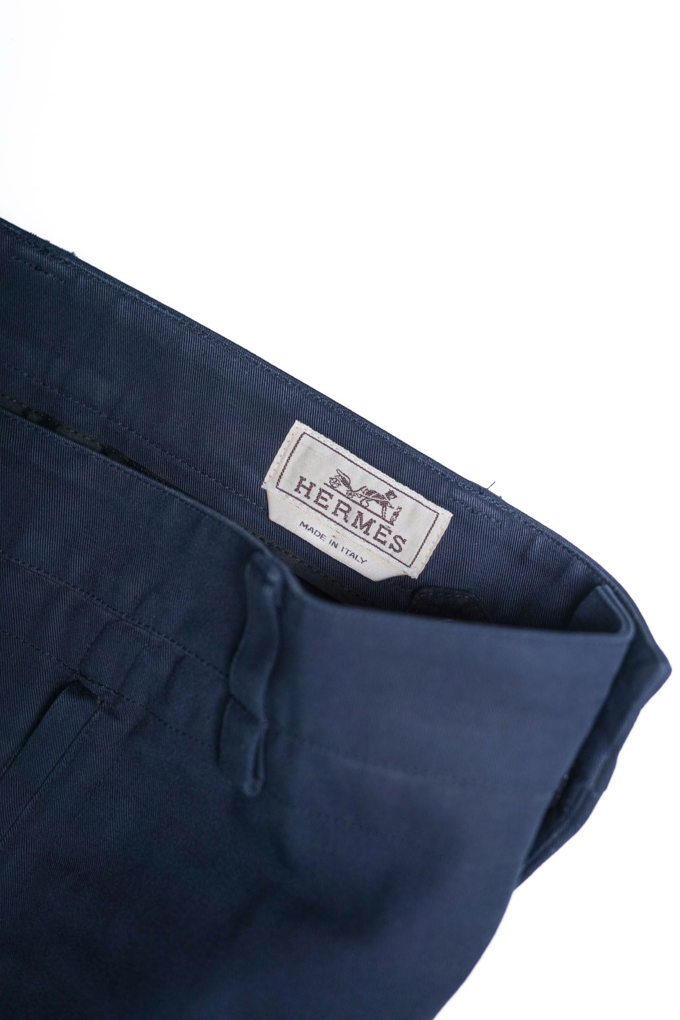 エルメスらしい無駄のない金属パーツは、光を受けても決して主張しすぎず、むしろパンツ全体の静謐なムードを引き立てる控えめなアクセントとして機能します。