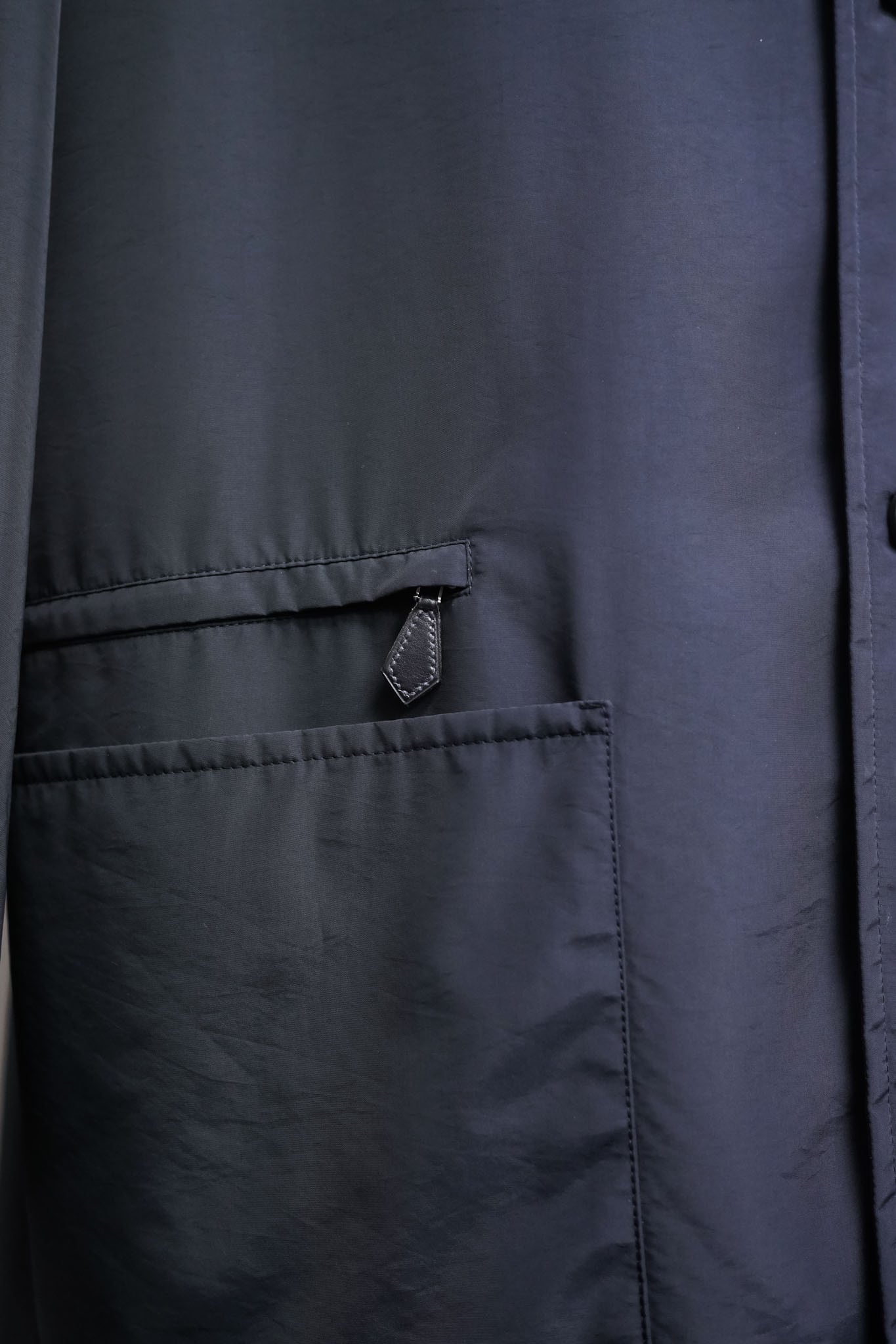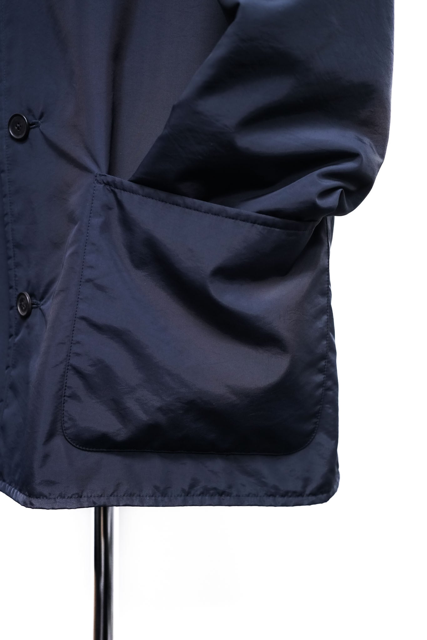 ナイロン × ポリエステルのコンビネーションは一見テクニカルウェアのようでありながら、手に触れると驚くほどしなやかで、布が小さく波打つような細やかな陰影を生みます。