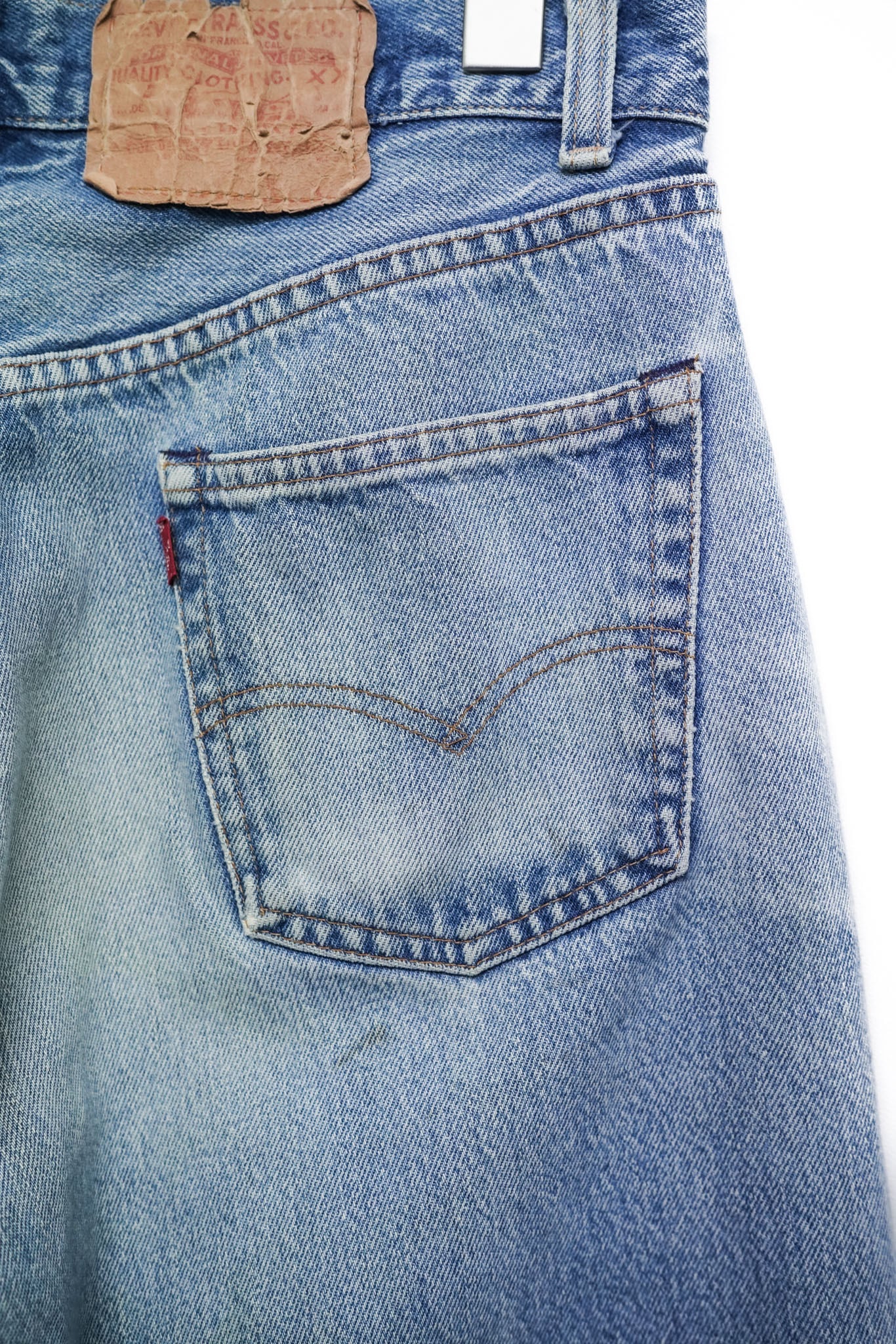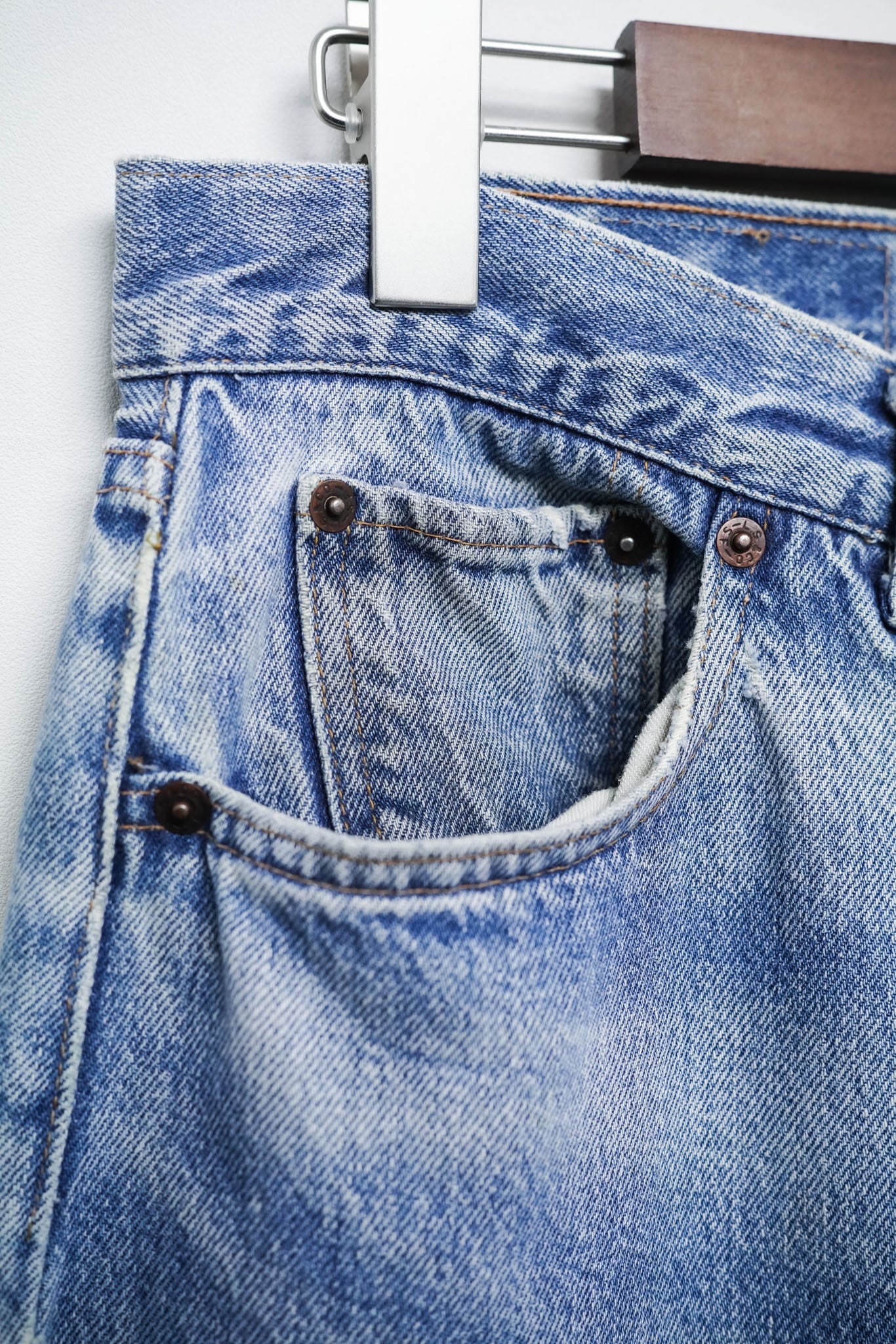 色落ちに関しても、80年代特有の淡いブルーと濃淡のあるグラデーションが絶妙で、ヒゲ・ハチノス・裾のアタリなど、長年の着用によってしか生まれない豊かな表情が魅力です。