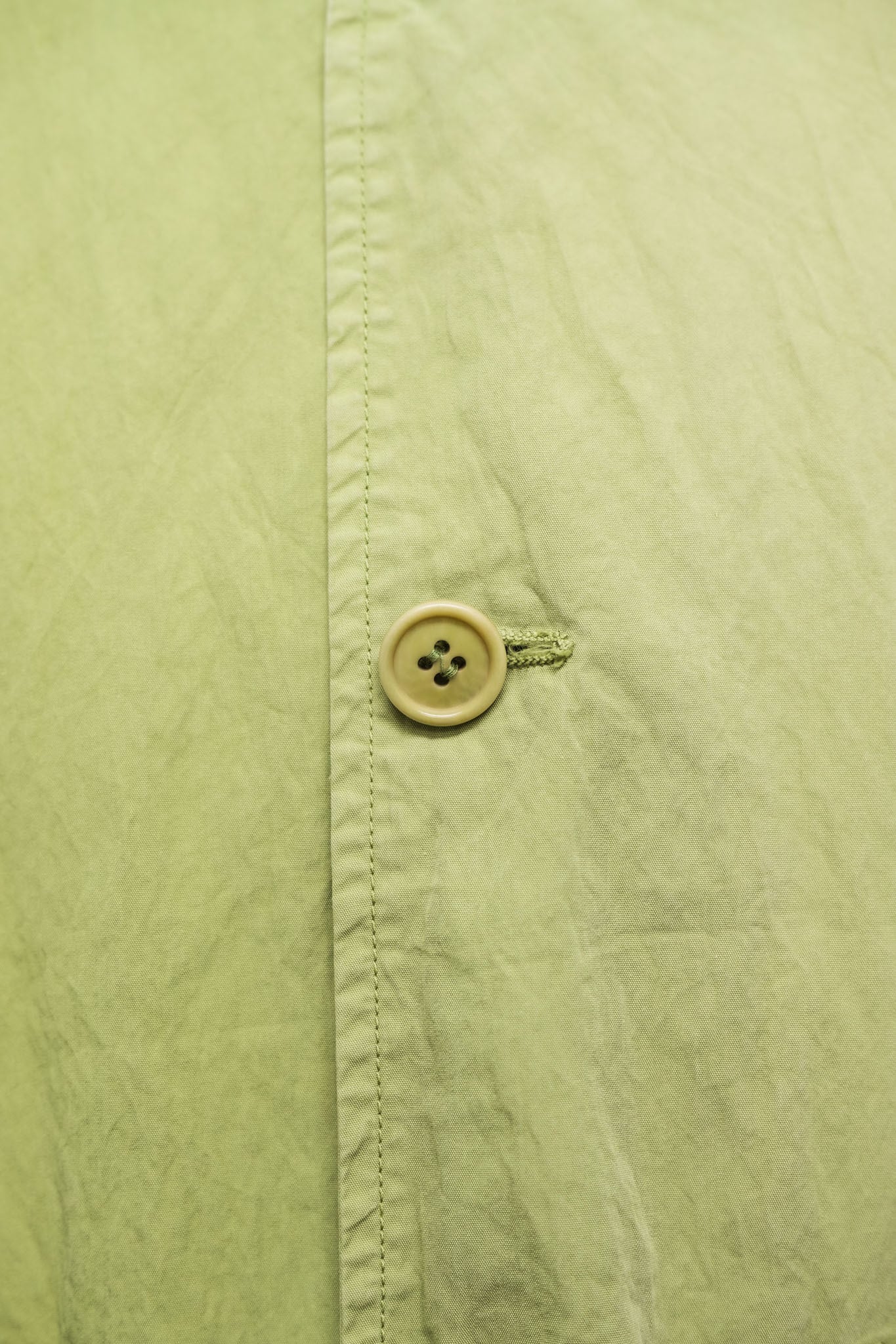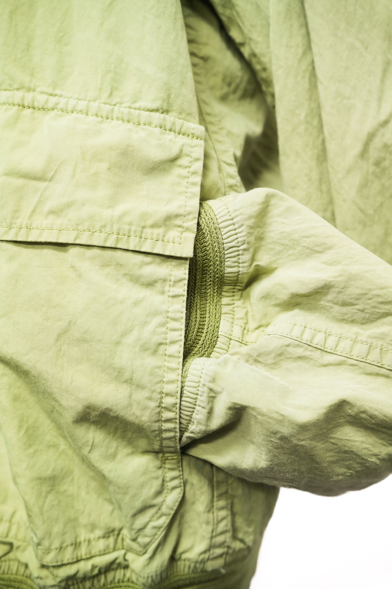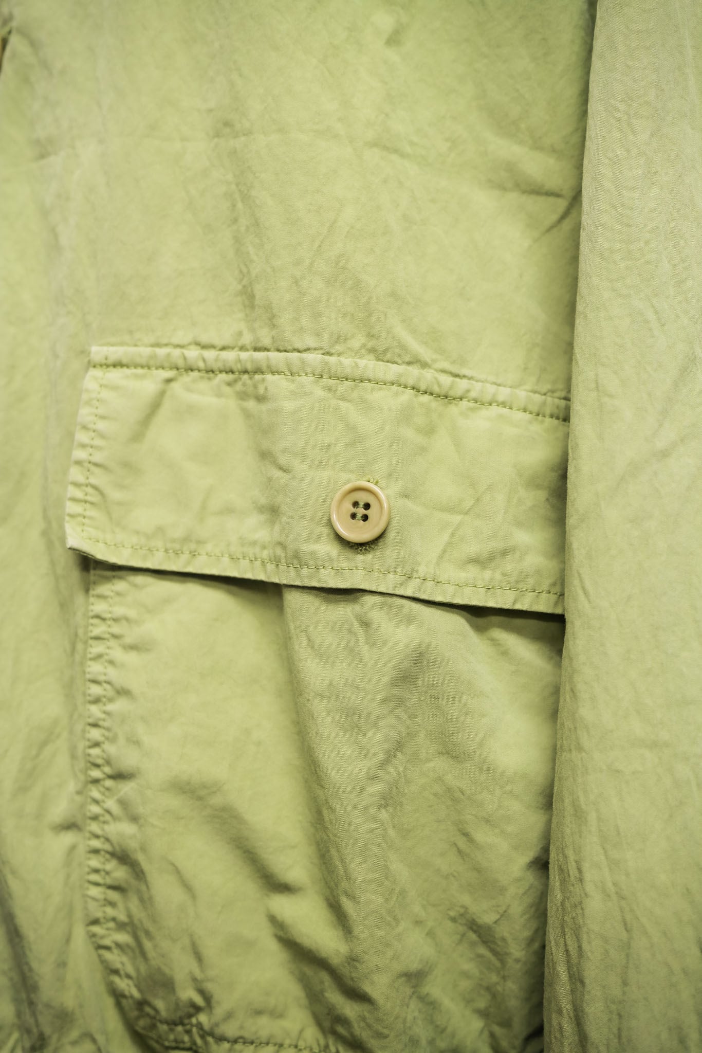 また、比翼部分に並ぶC.P. COMPANY刻印入りメタルスナップの鈍い光沢が、淡いグリーンの上で静かなアクセントとなり、製品染めの歪みやアタリがさらに強調されます。