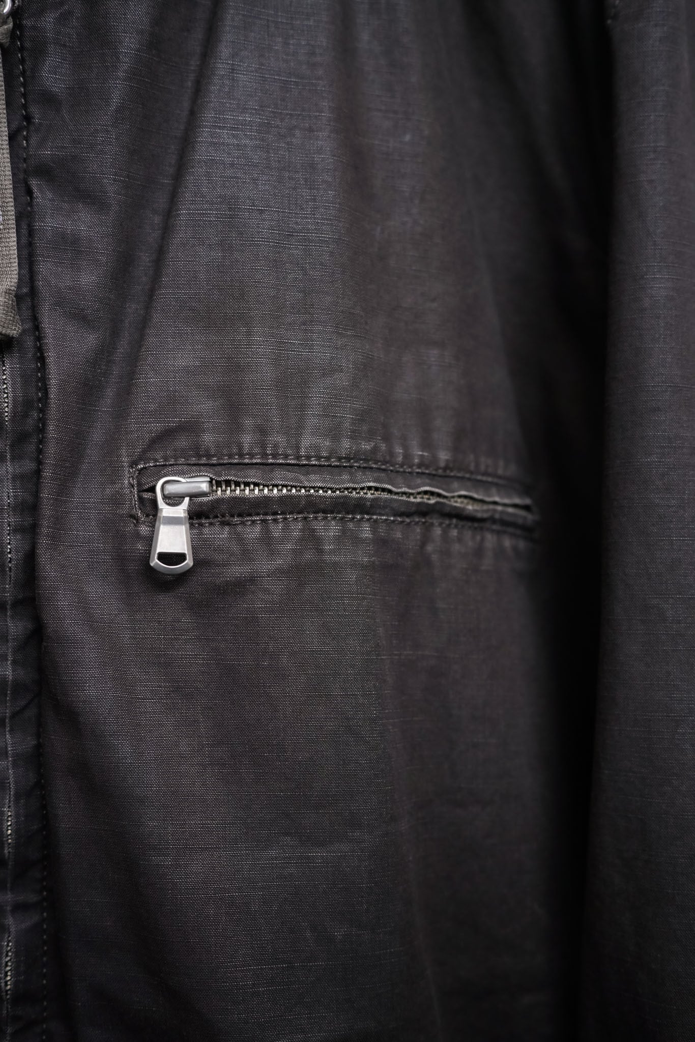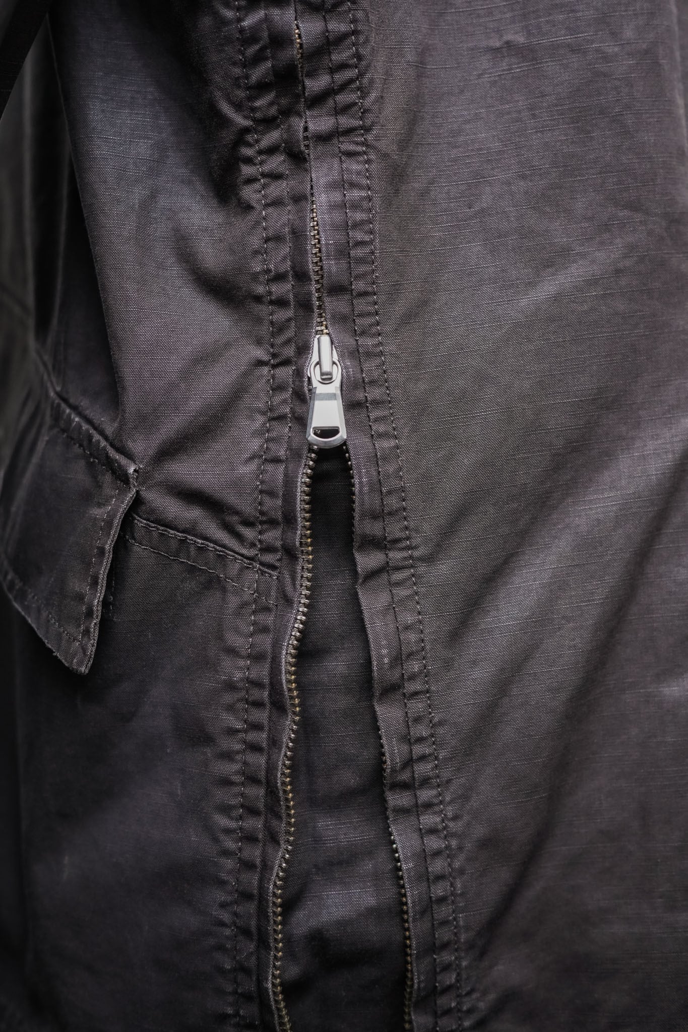 染色のムラ感、ジップテープの強い機械的表情、リネンのような粗野さを含むコットンの質感。