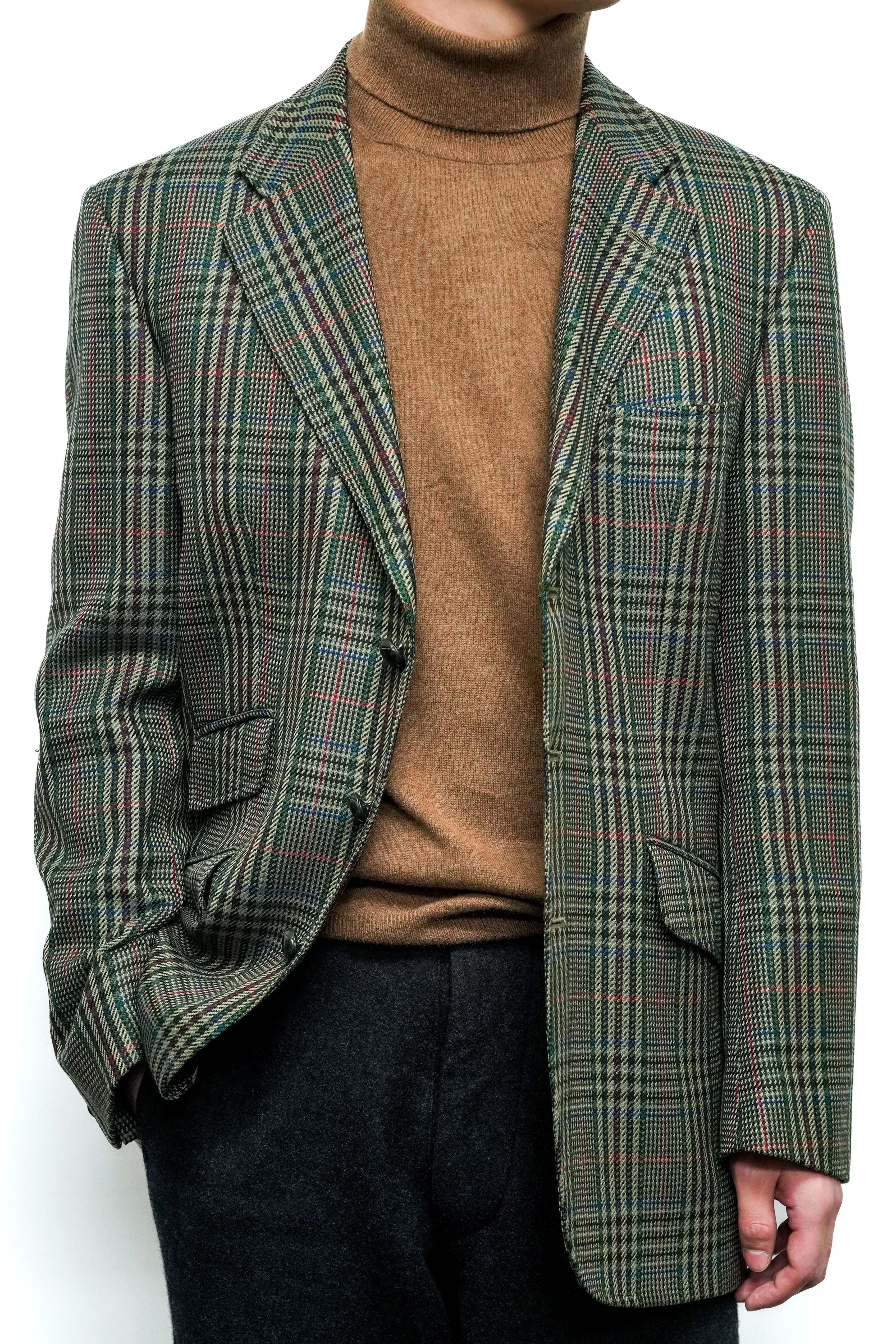 グリーンを基調に、ブルーとレッドが静かに交差する英国チェック。クラシックでありながら土臭さはなく、着ると自然に今のスタイルに馴染むバランス感。