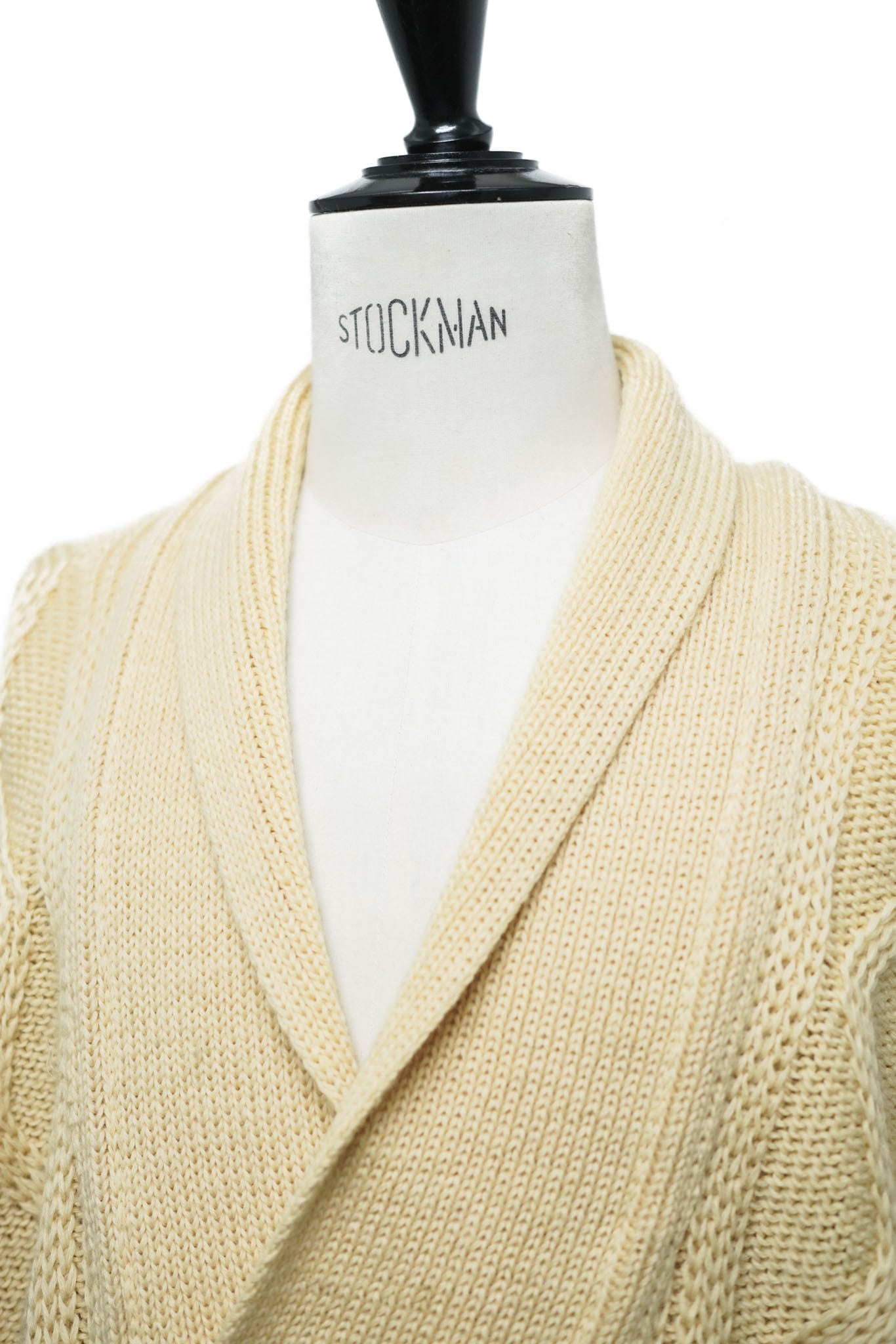 本品は1980年代頃の一着。伝統的なアランニットをベースに、ショールカラーとダブルブレスト仕様を採用した、非常に珍しいニットジャケット型です。ニットでありながら構築的で、前を留めればアウターのような佇まい、開ければ自然なドレープが生まれ、セーター以上・コート未満の独特のバランスで着用いただけます。