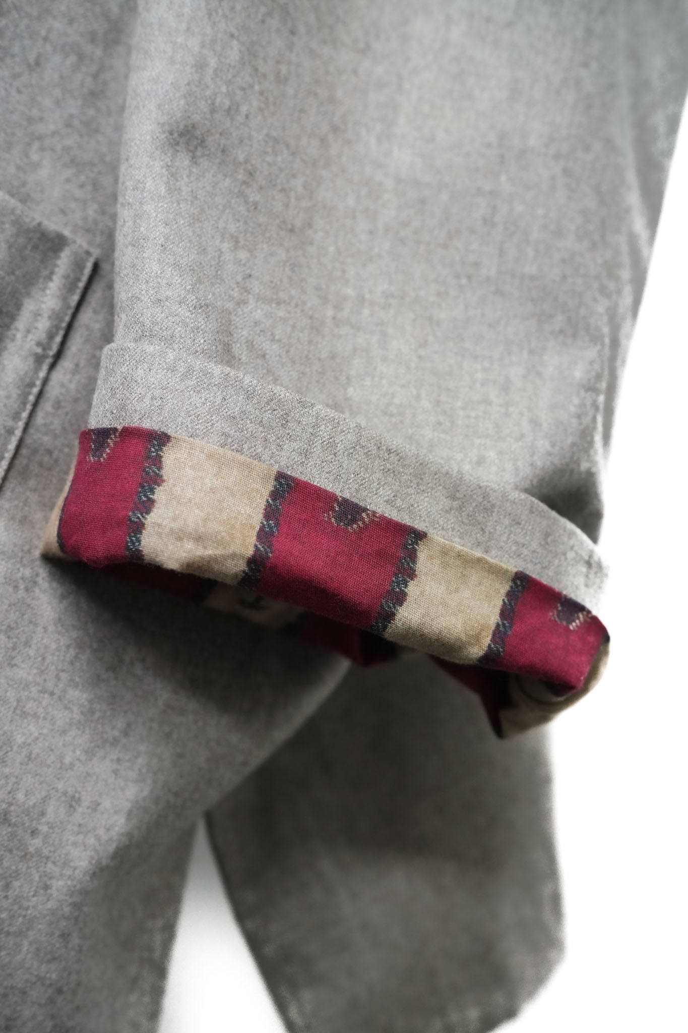 袖を折り返すと現れる裏地のテキスタイルや、縫製の端正さからは、表に出ない部分にこそ美を見出すエスカンダーの姿勢が垣間見えます。