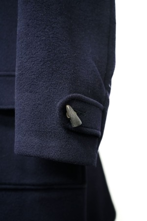 生地には、しっかりと打ち込みのあるウールメルトンを使用。過度に重すぎることはなく、それでいて密度が高く、着用時には自然な落ち感と包み込むような安心感があります。ネイビーの色味も深く、いかにも英国らしい実直さを感じさせる表情。
