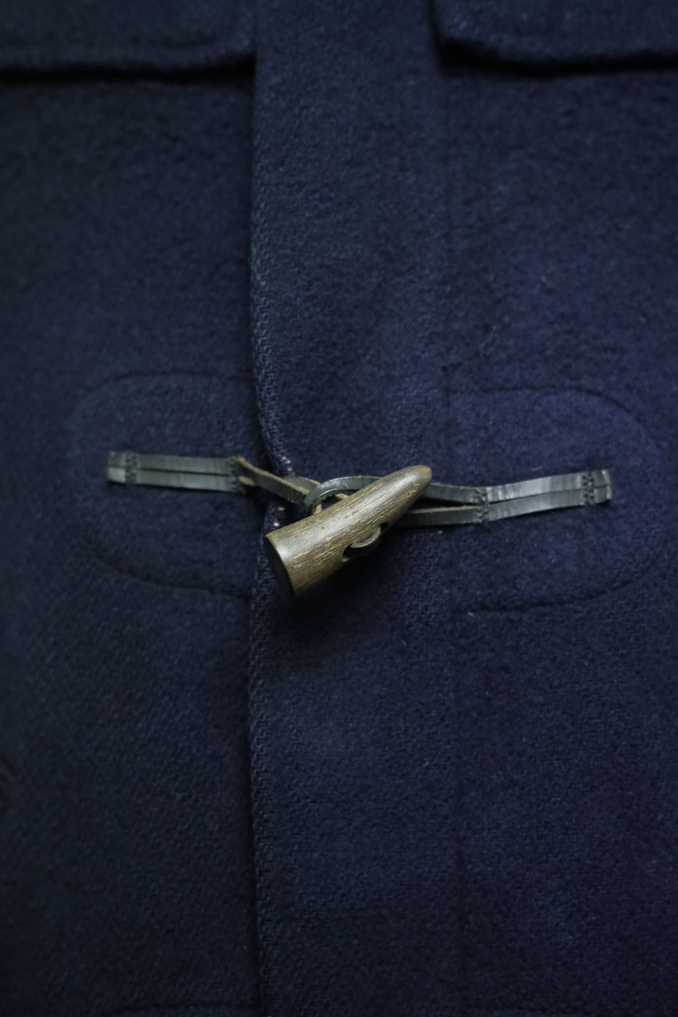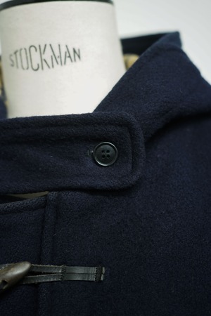表地にはしっかりとしたウール素材を使用。裏地にはブランドを象徴するクラブチェック柄のウールライニングが配され、防寒性と耐久性を兼ね備えています。フロントはレザー紐とトグルによる伝統的なダッフル仕様。フード一体型、フラップ付きポケット、袖口ストラップなど、実用性を重視した英国クラシックなディテールが揃います。