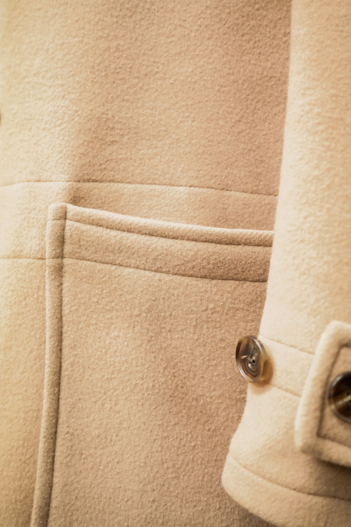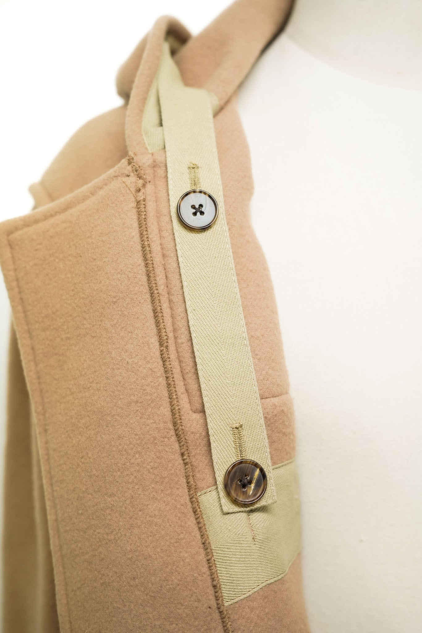 本来は重く無骨になりがちな英国ダッフルの質感を保ちつつ、カシミア混ならではの滑らかさと、起毛のきめ細かさによって、肌当たりと落ち感に品の良さを与えています。単なるヴィンテージの再現ではなく、現代の着用環境を前提に素材をアップデートしている点は、マルジェラらしい編集と言えるでしょう。