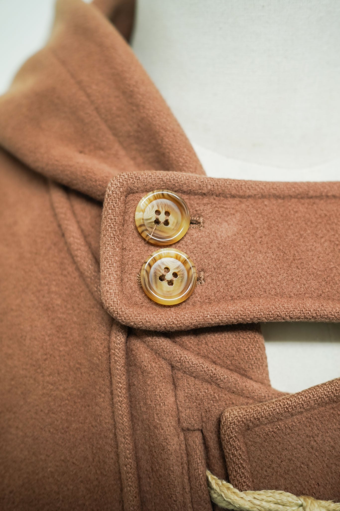 フロントはナチュラルウッドトグルとロープによるクラシックなダッフル仕様。