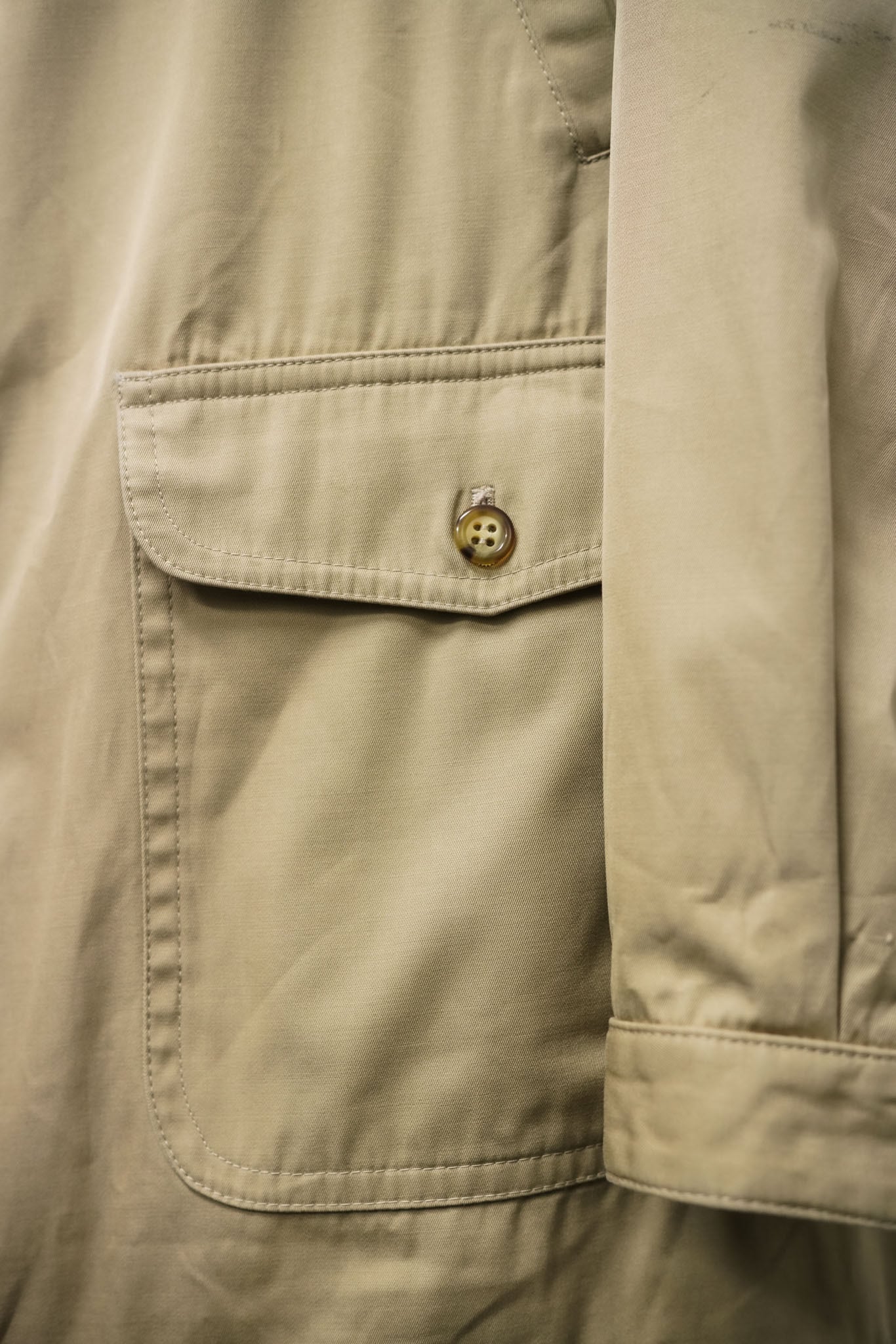 天然素材の持つ落ち着いた風合いと、化学繊維由来の耐久性・安定性を兼ね備えた生地で、当時の実用アウターに多く用いられていた仕様です。
