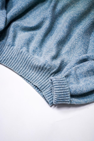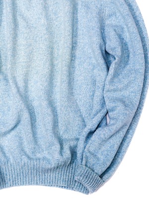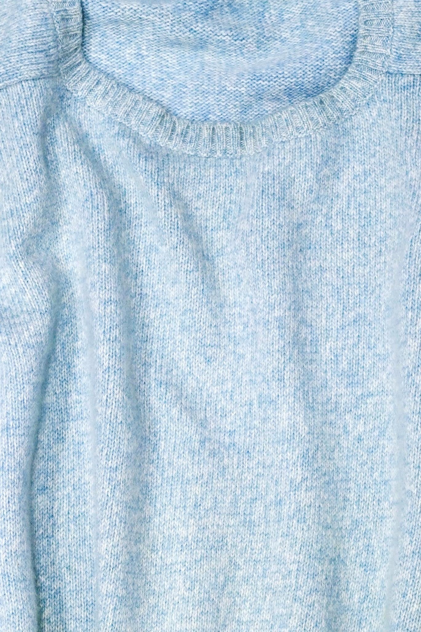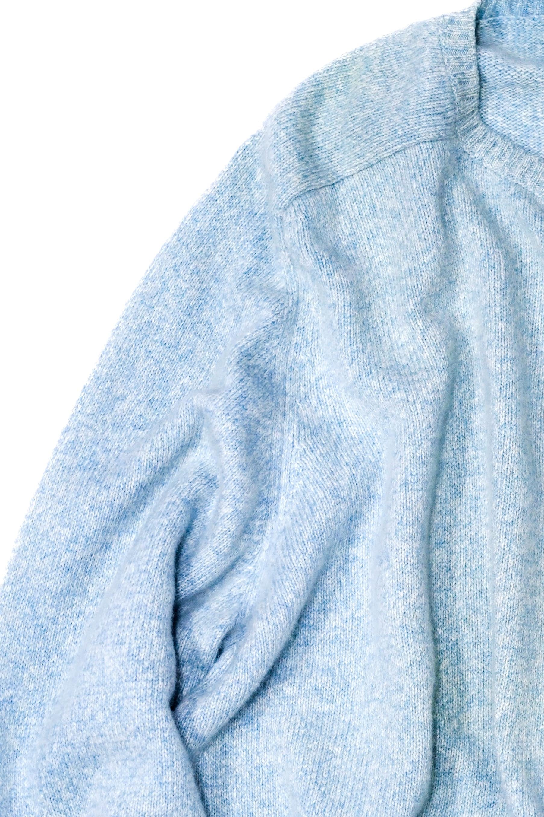 素材はカシミア100%。単色糸ではなく、複数の色糸を組み合わせたメランジ糸を使用しています。淡いブルーを基調としながら、色の濃淡が均一にならず、色幅のある表情が確認できます。maloは製品染めによる色出しよりも、糸段階で色を構成する手法を多く採用しており、本品も糸色の組み合わせによって色味を形成している点が特徴です。表面に単調さが出にくく、編み地の立体感が視覚的に分かる色調となっています。