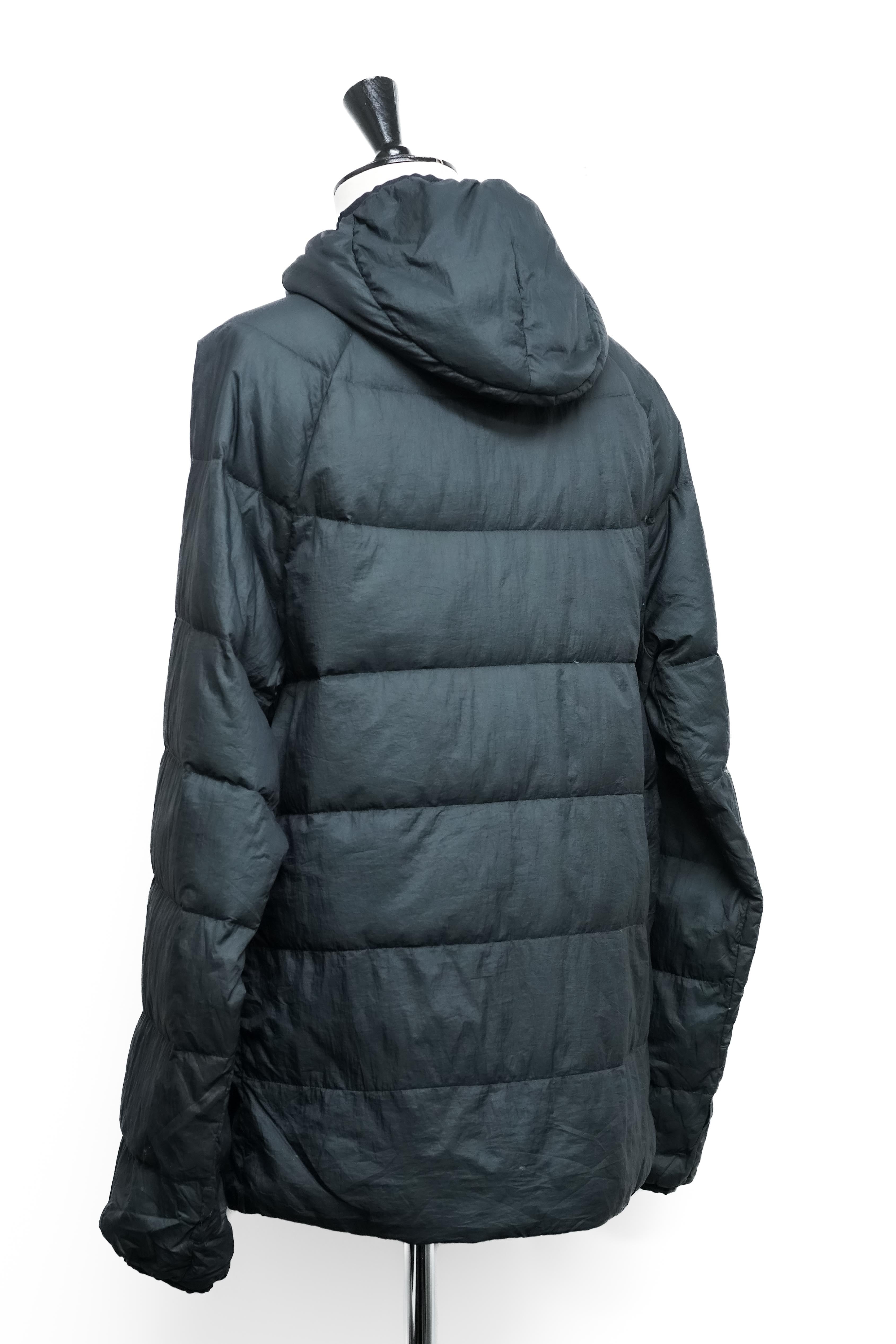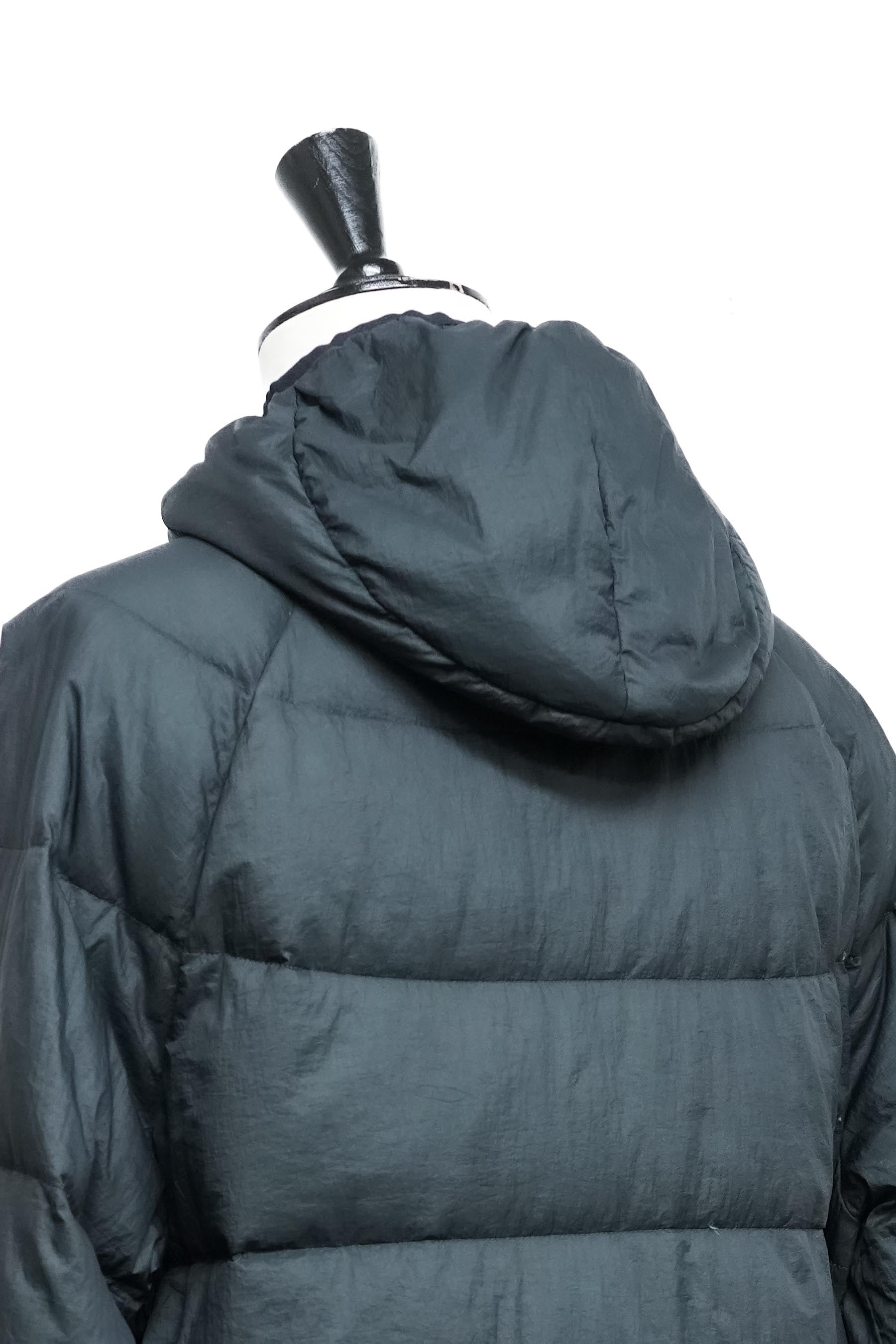本体カラーはブラック。表地・裏地ともに主素材はポリアミド(ナイロン系)を使用しており、軽量でしなやかな質感が特徴です。中綿にはホワイトダックダウン90%、フェザー10%を使用。保温性を確保しつつも過度なボリュームを抑えた仕様で、タウンユースを前提としたバランスの良い仕上がりとなっています。