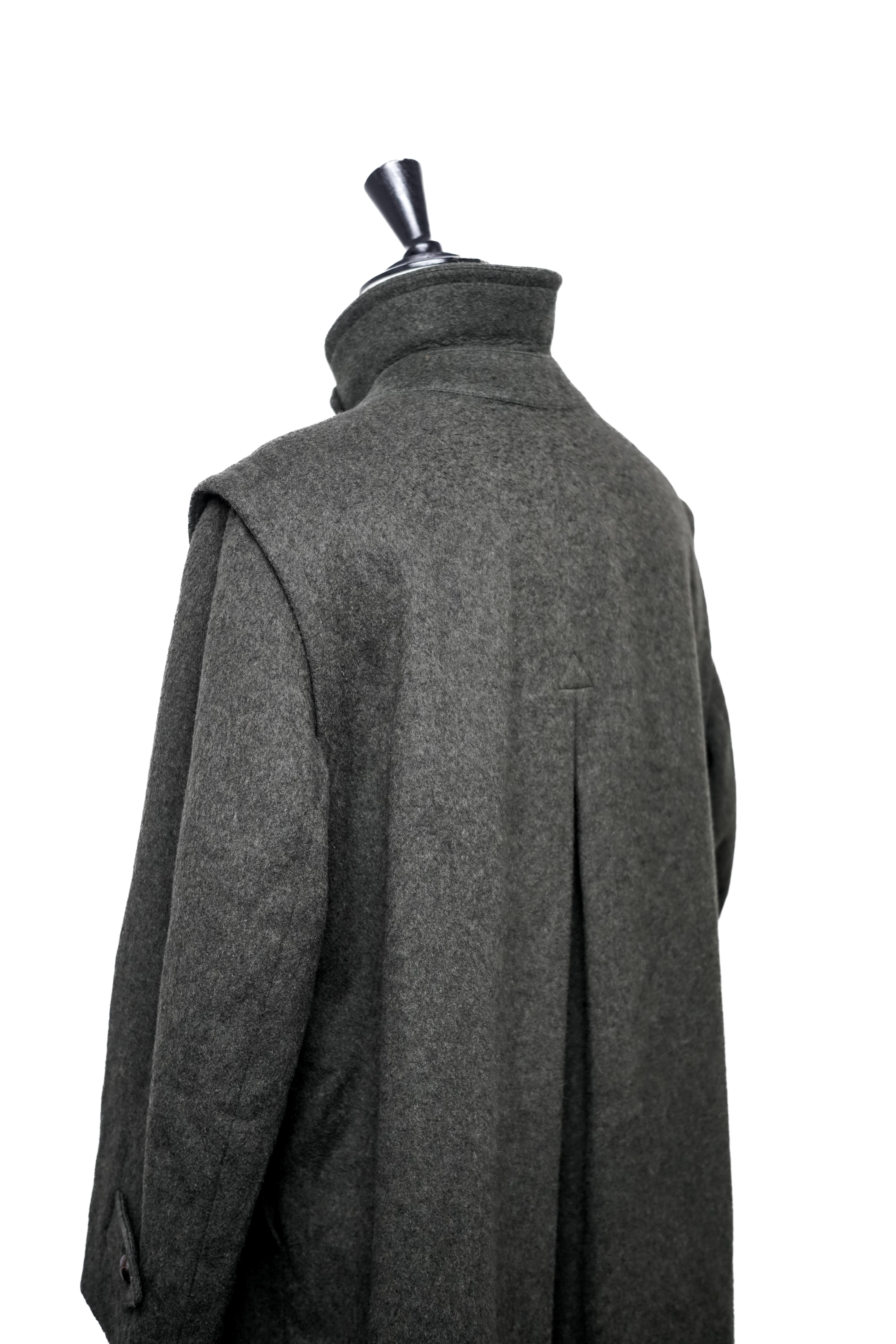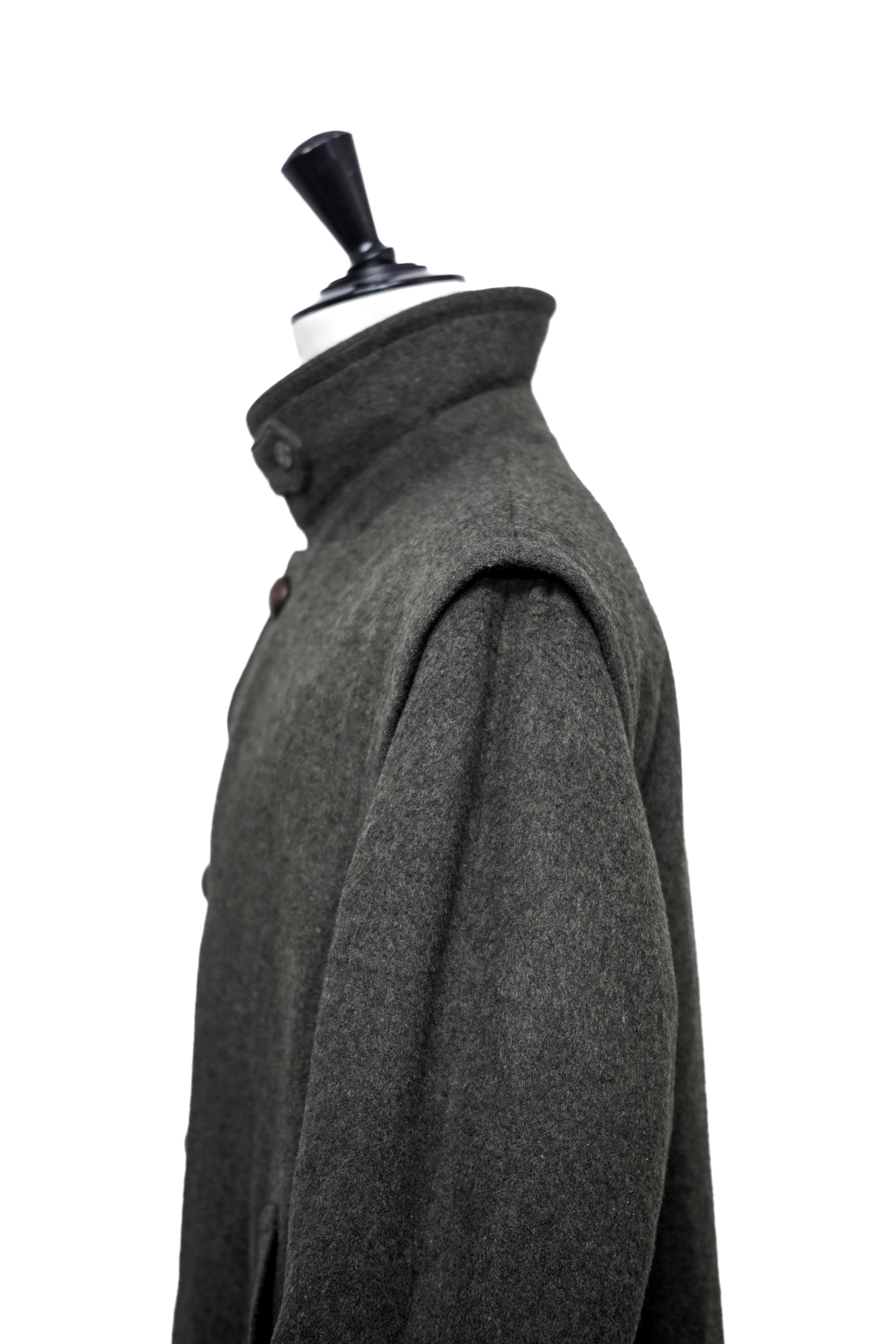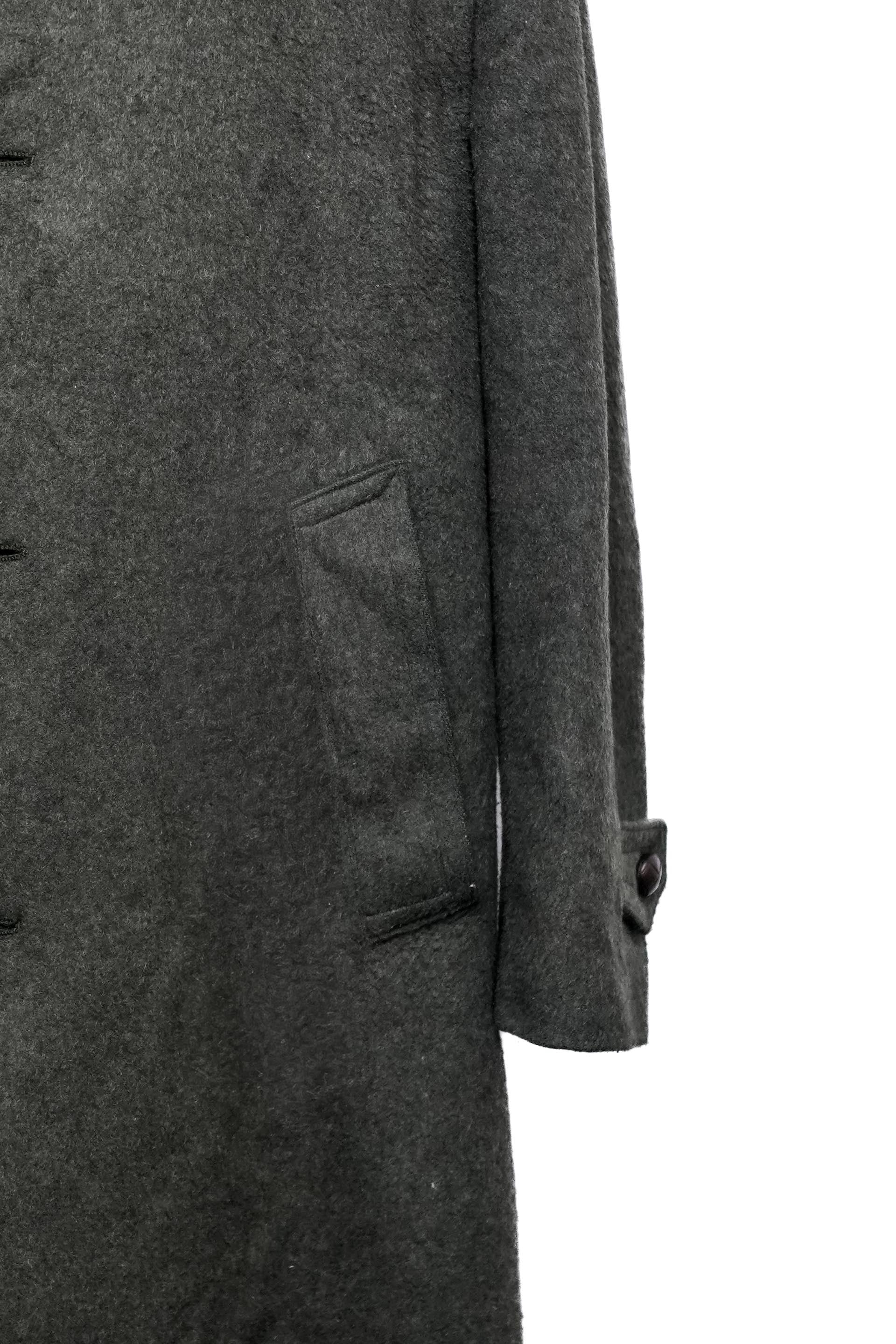 シルエットは過度に細身ではなく、ローデンコートとして標準的なバランス。インナーを選ばず着用できる設計となっています。裏地は総裏仕様で、着脱時の滑りや保温性にも配慮された構造です。縫製は全体的に整っており、実用品としての完成度の高さが確認できます。