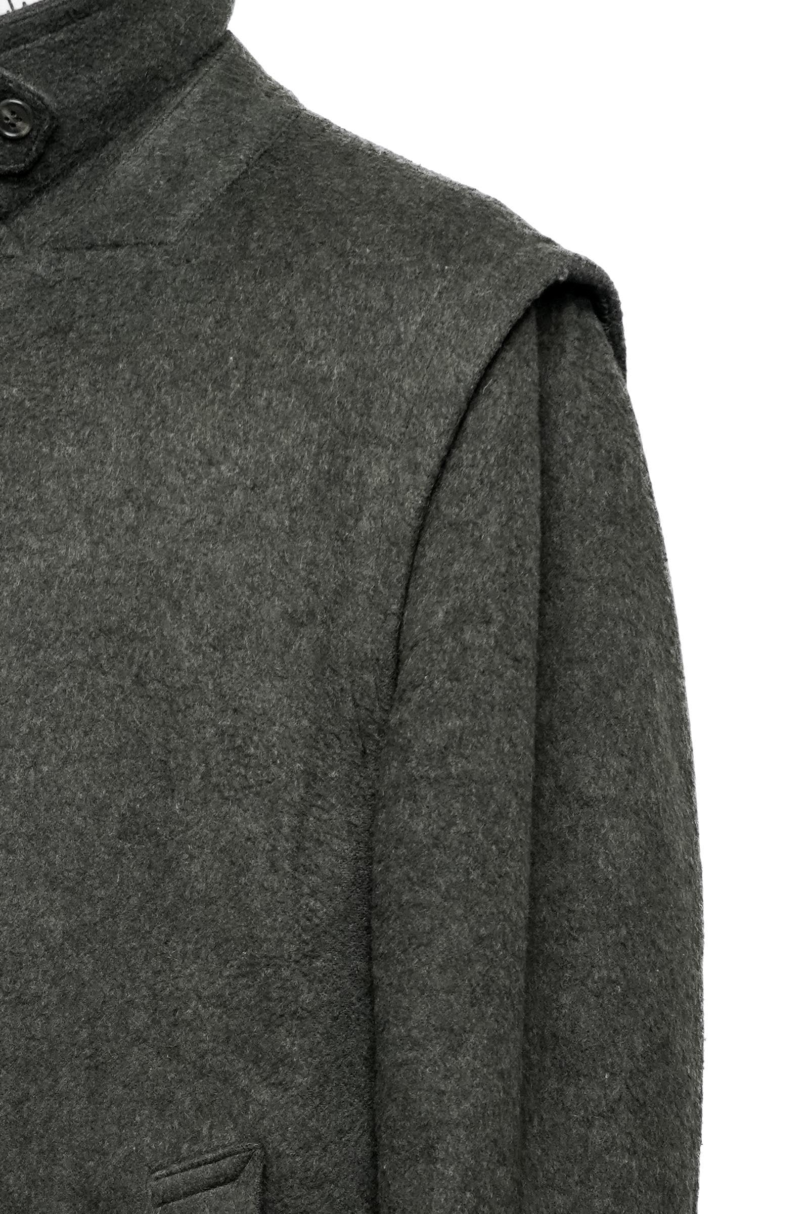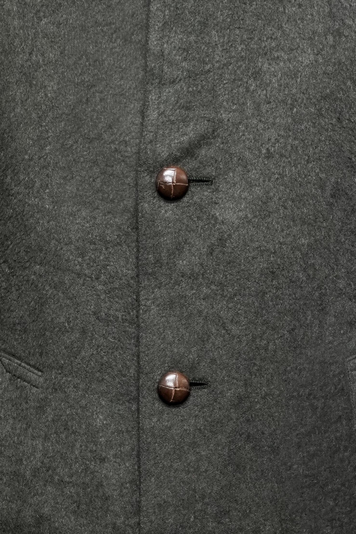 本品においても、ローデン特有の起毛感を伴うマットな表情が確認でき、生地全体のコンディションは均一です。カラーはオリーブグリーン系で、濃淡のばらつきが少なく、落ち着いたトーンを保っています。