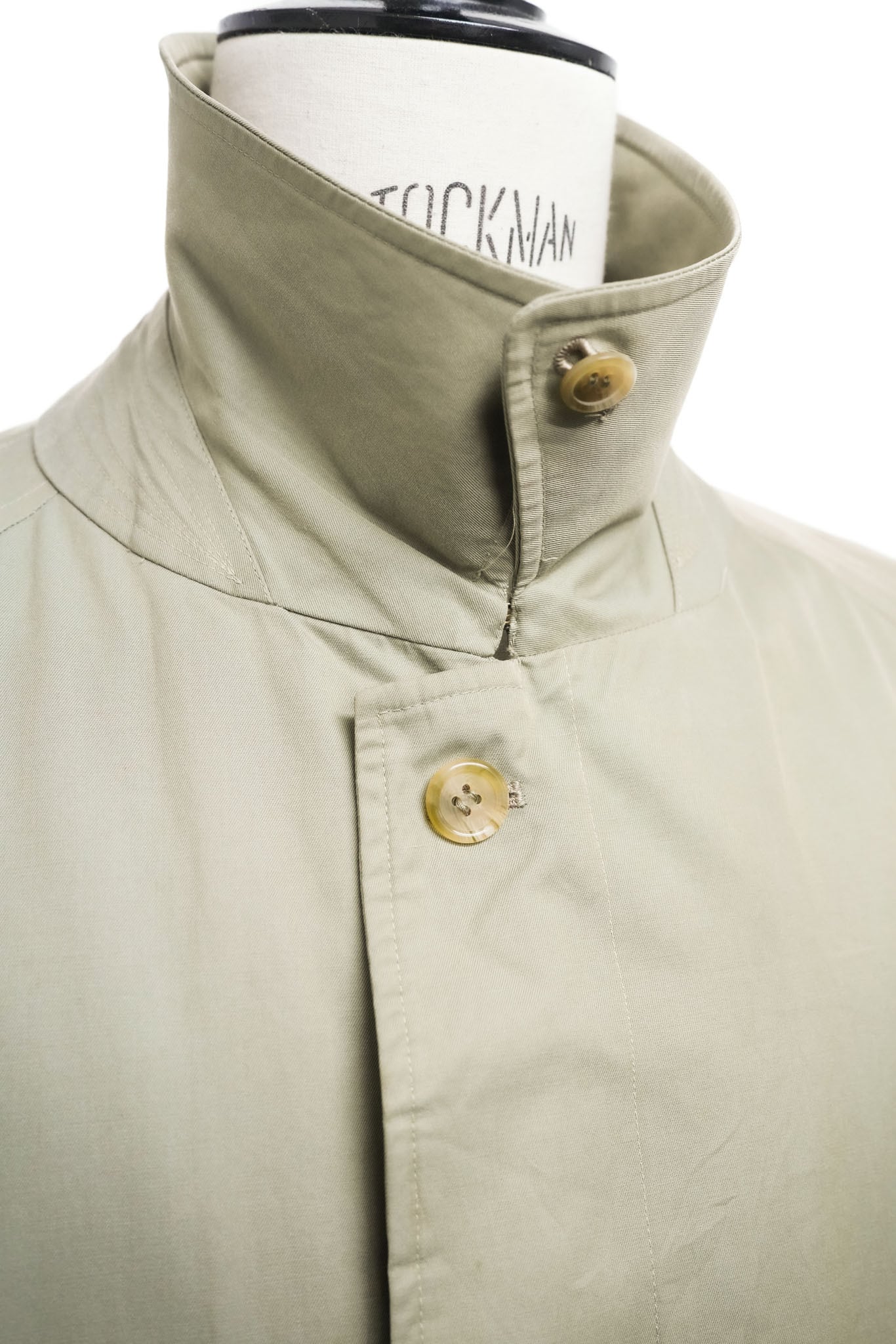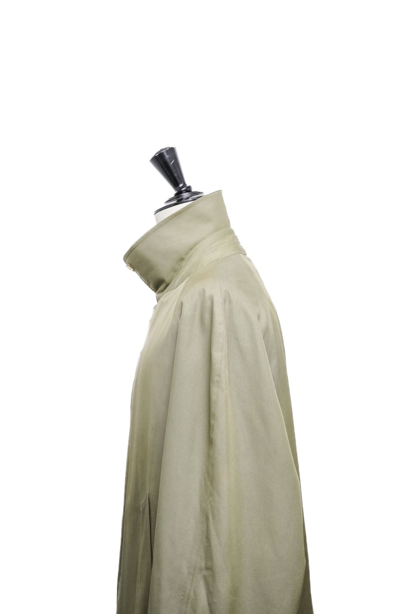 襟を立てれば、首元を包み込むような立体感が生まれ、英国的な防風性と凛とした表情が同時に立ち上がる。