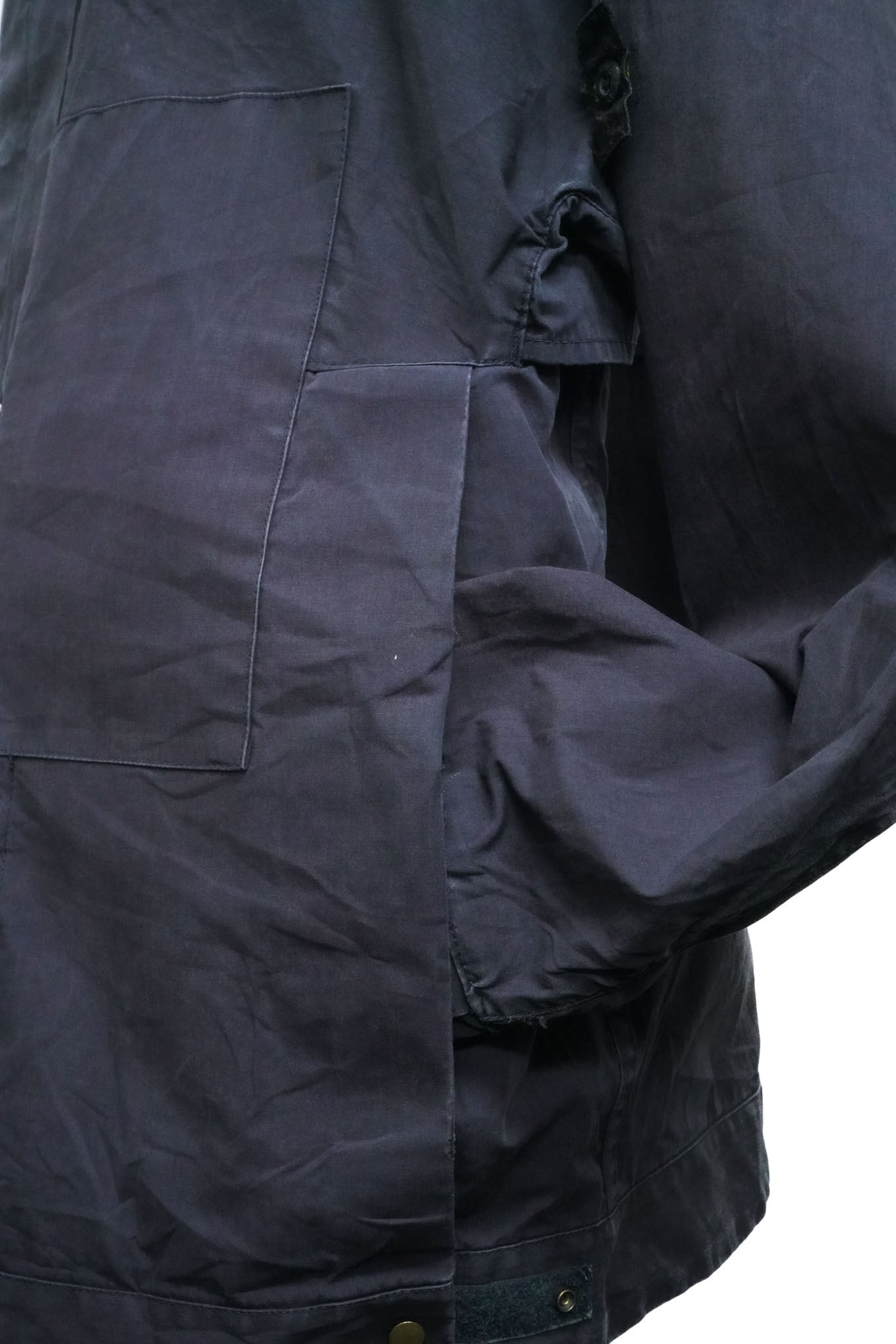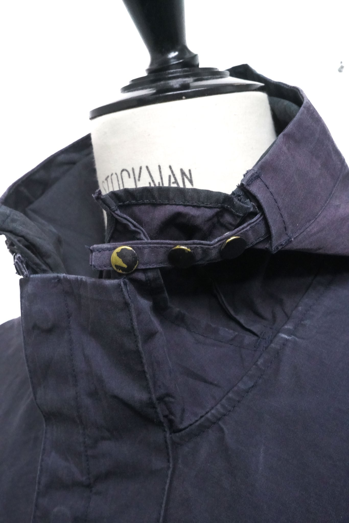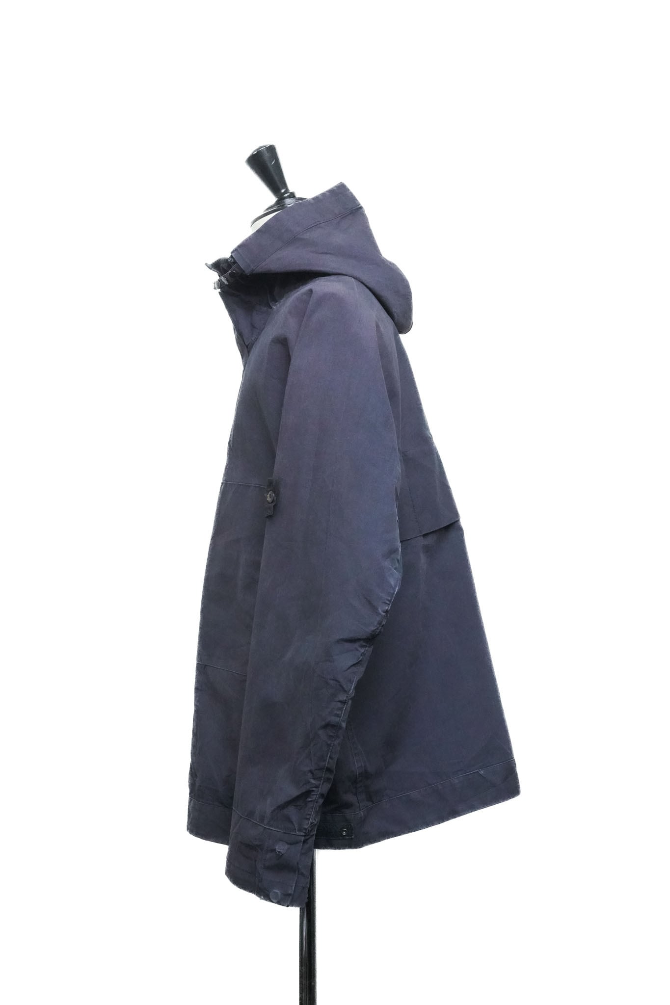 まるでゴム引きコートのようなマットで厚みのある質感を有しており、表面には時間の経過によって生まれた自然な濃淡が広がり、深いネイビーにわずかな墨色を溶かしたような色調に複雑な陰影を与えています。